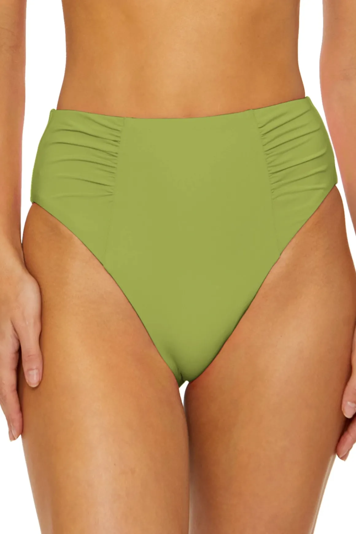 High waist bikini bottom features shirred sides and offers moderate coverage.