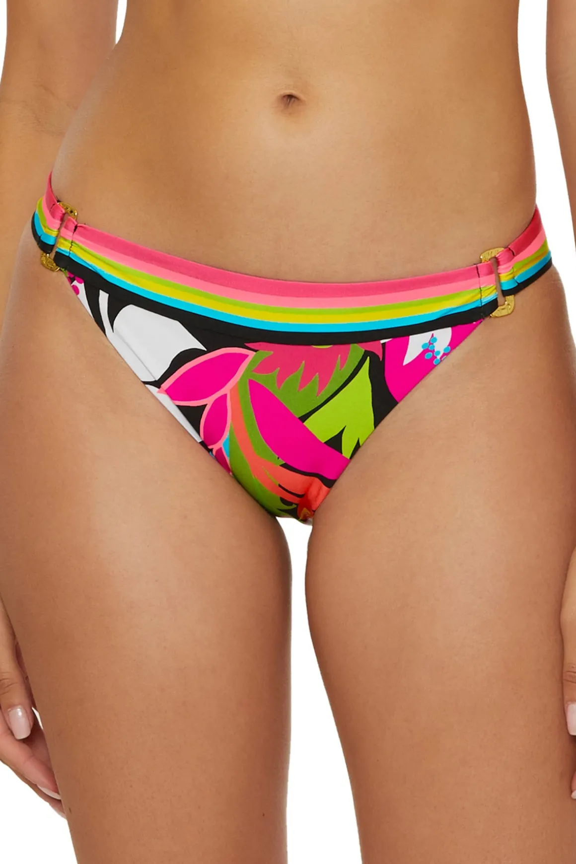 Hipster bikini bottom features shirred sides with hammered gold-tone rectangle connectors and offers moderate coverage.