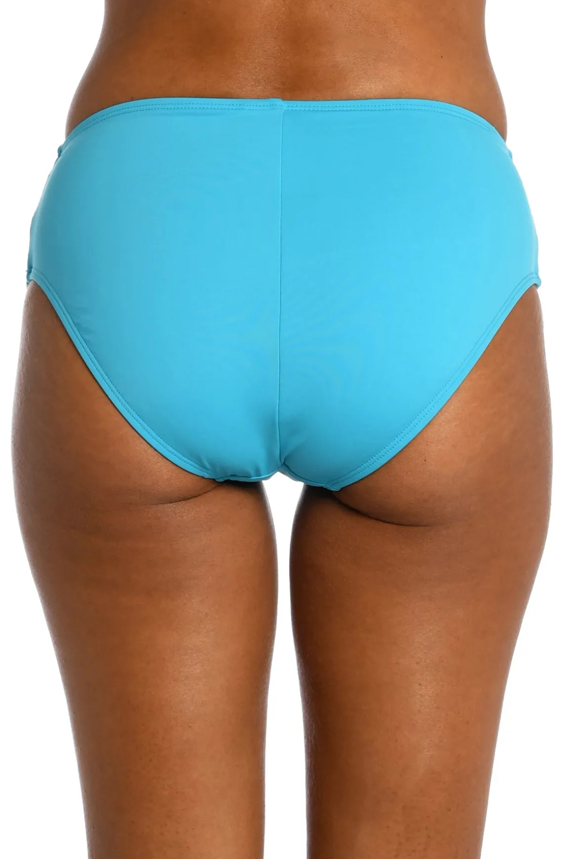 High waist bikini bottom features a shirred elastic waistband and offers moderate coverage.