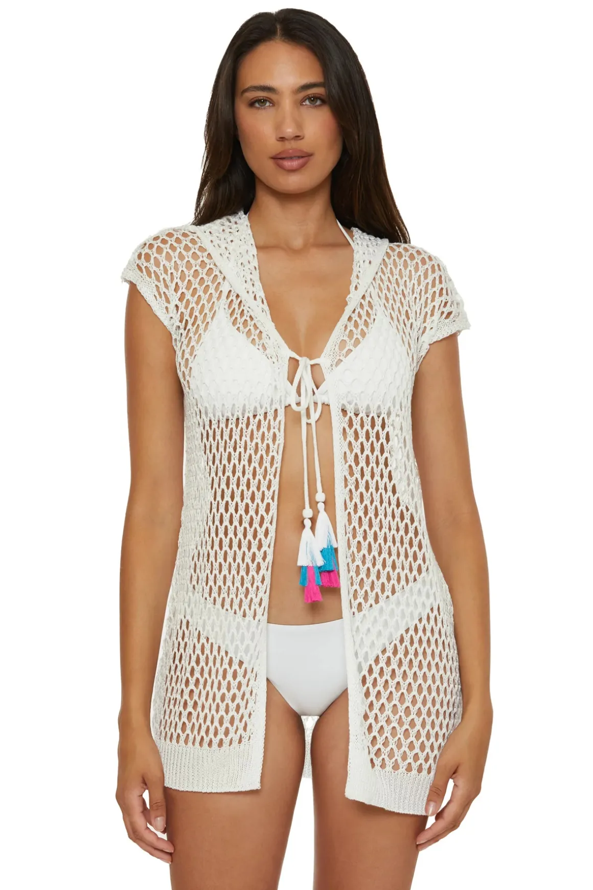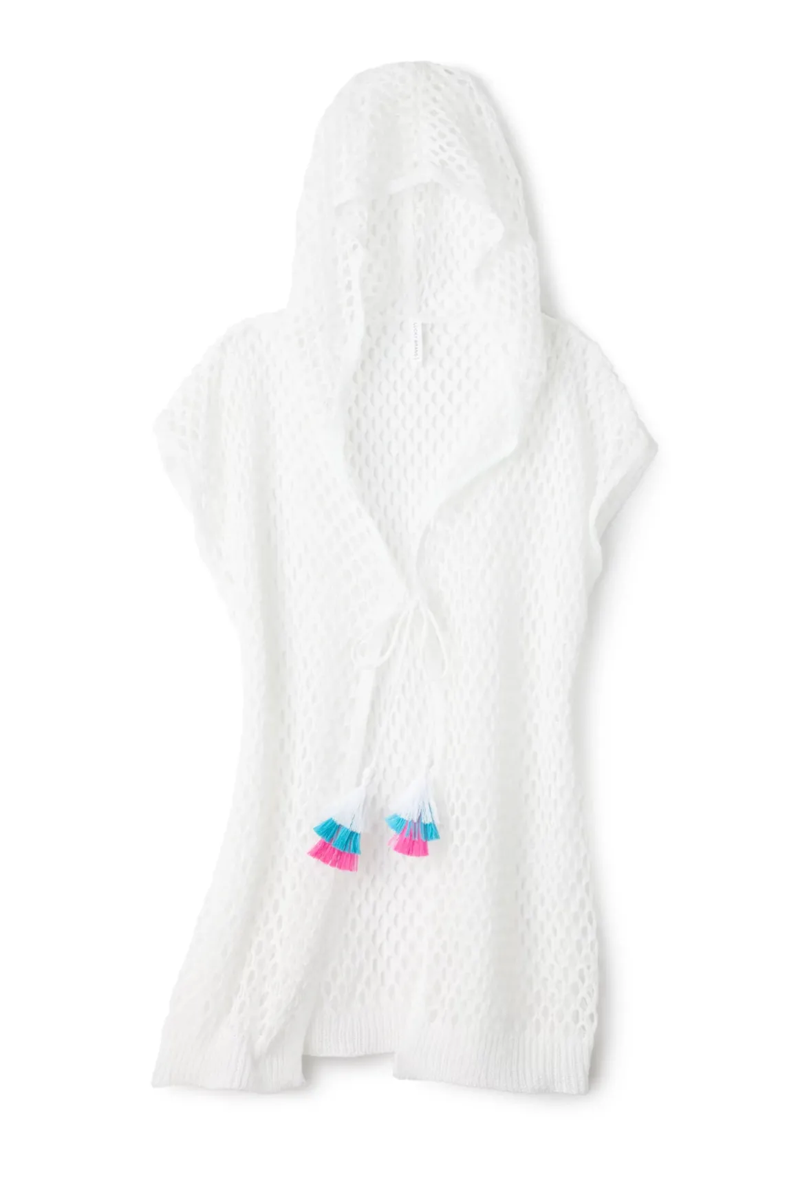 Tunic features open weave crochet, short sleeves, a hood, and a front tie with tassel details.