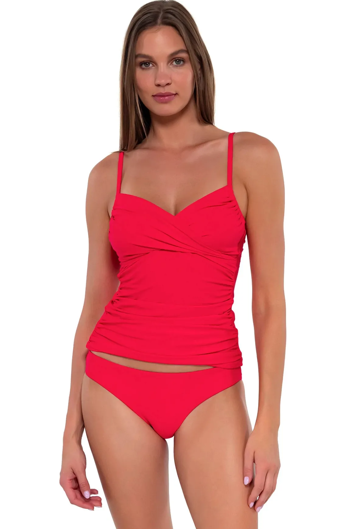 The Simone Tankini is sleek and sophisticated. With shirring along the sides and a flattering crossover neckline, this tankini is a summer staple. Features include over the shoulder adjustable straps that can be converted to a cross back, removable cups, and matching colored lining.