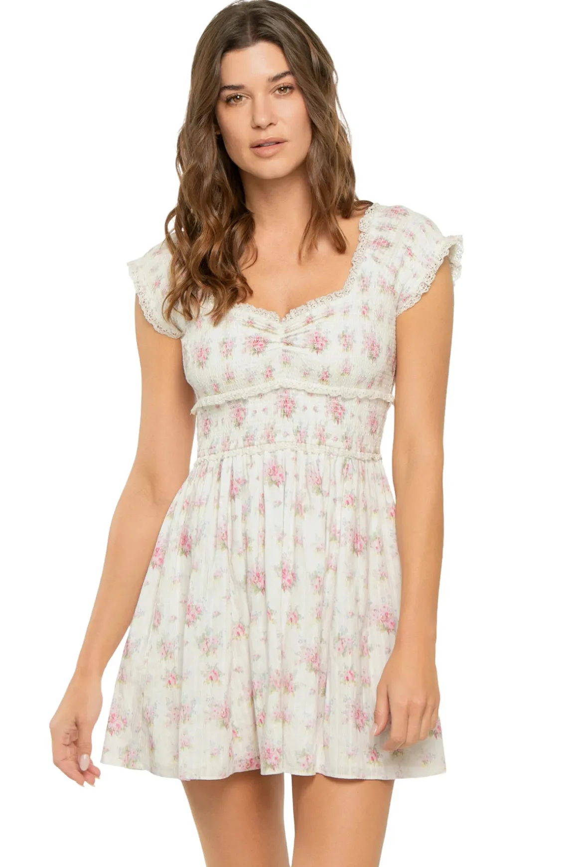 Siona mini dress features ditsy floral print, smocked top, and lace trim.