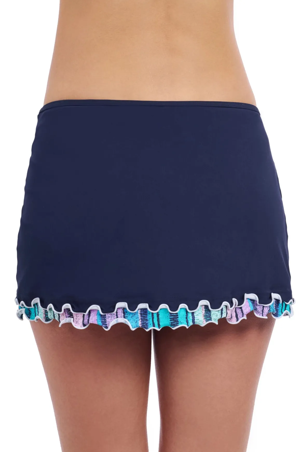 Skirted hipster bikini bottom features a ruffle hem, side slit and offers full coverage.