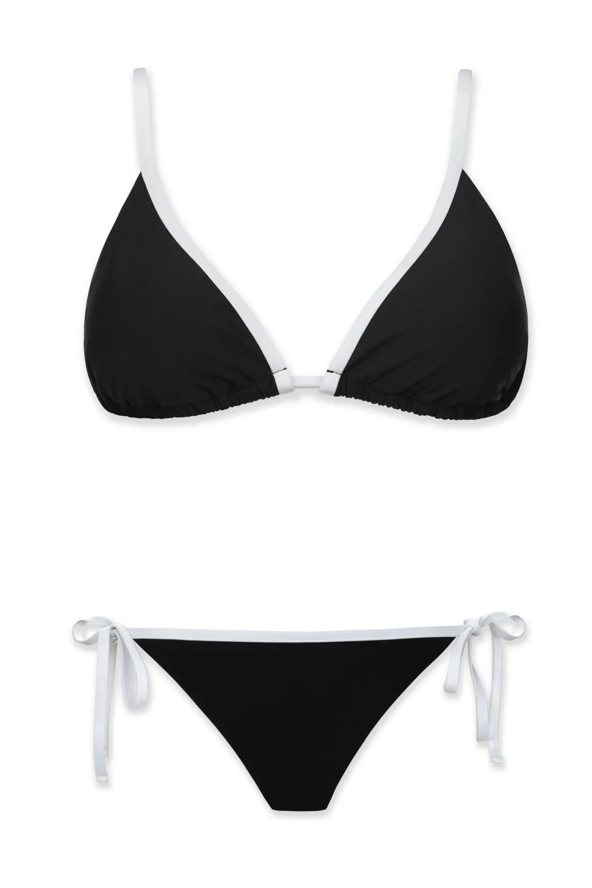 Triangle bikini top features contrast binding, over the shoulder design, and ties at back.