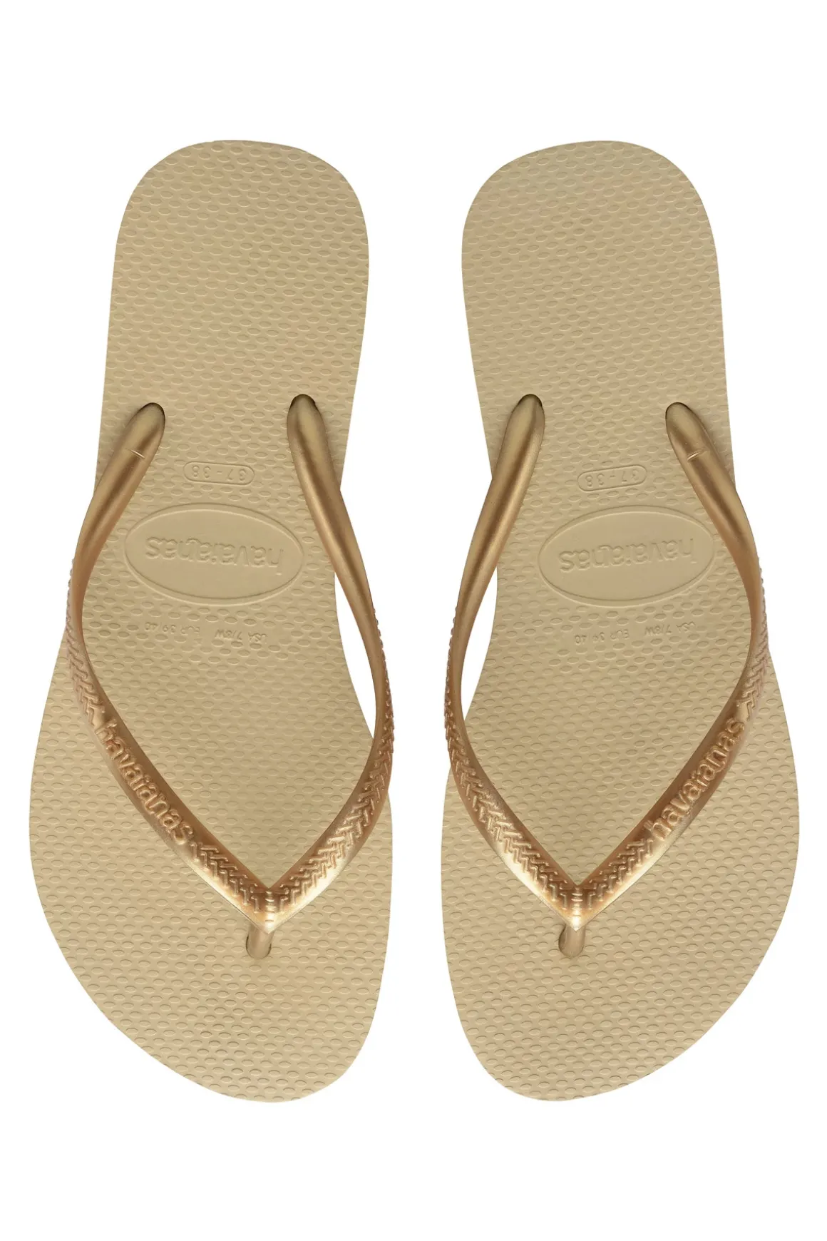 Slim flip flops with metallic logo strap and rubber soles.