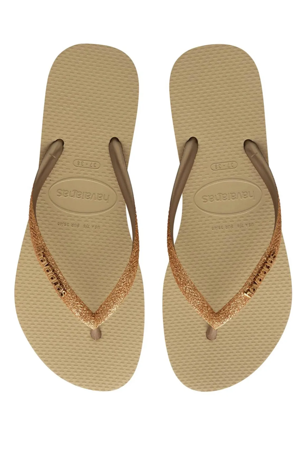 Slim flip flops feature confetti glitter thong straps and a cushioned footbed with a textured rice pattern and rubber sole.