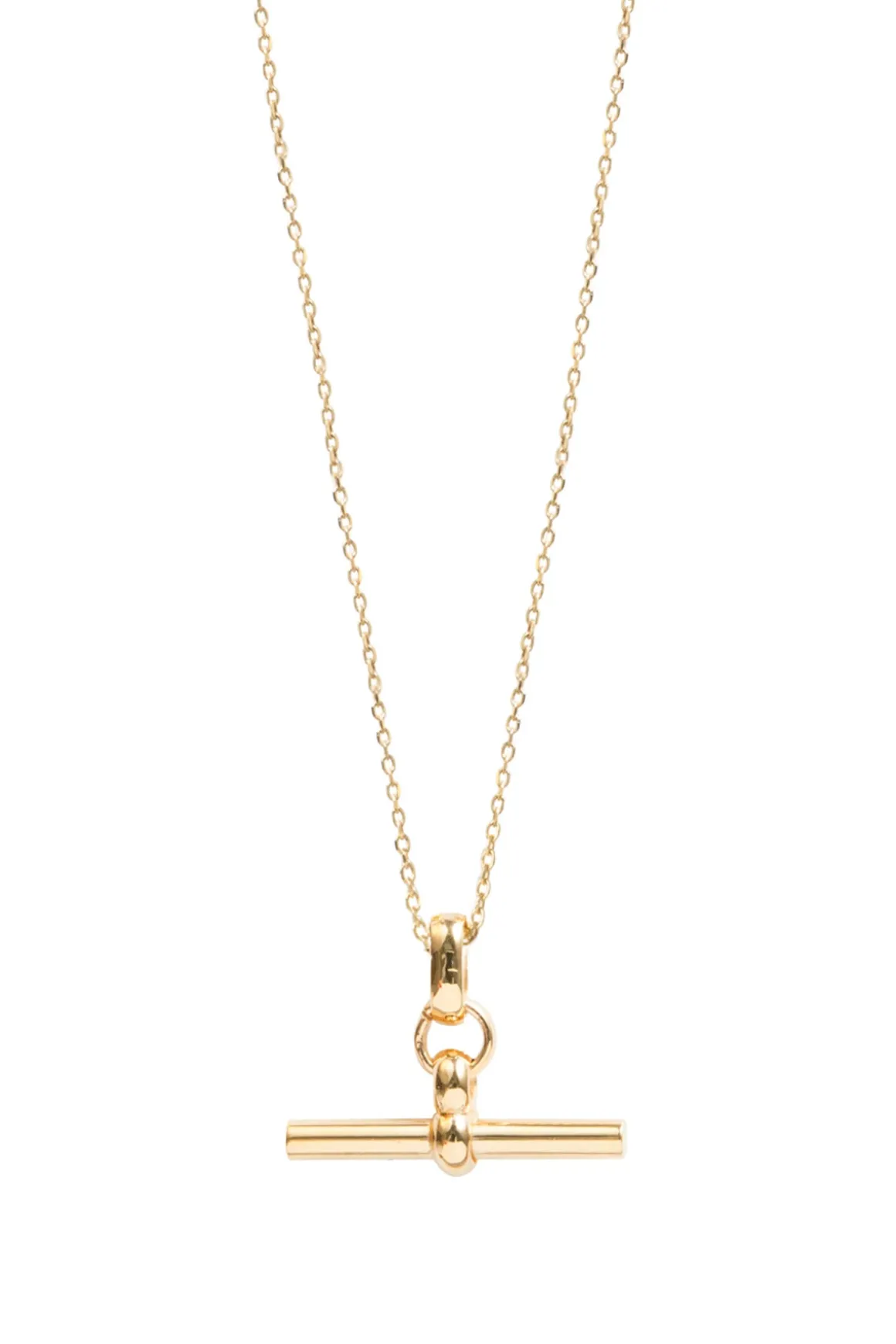 Necklace features a trace chain with a small t-bar pendant.