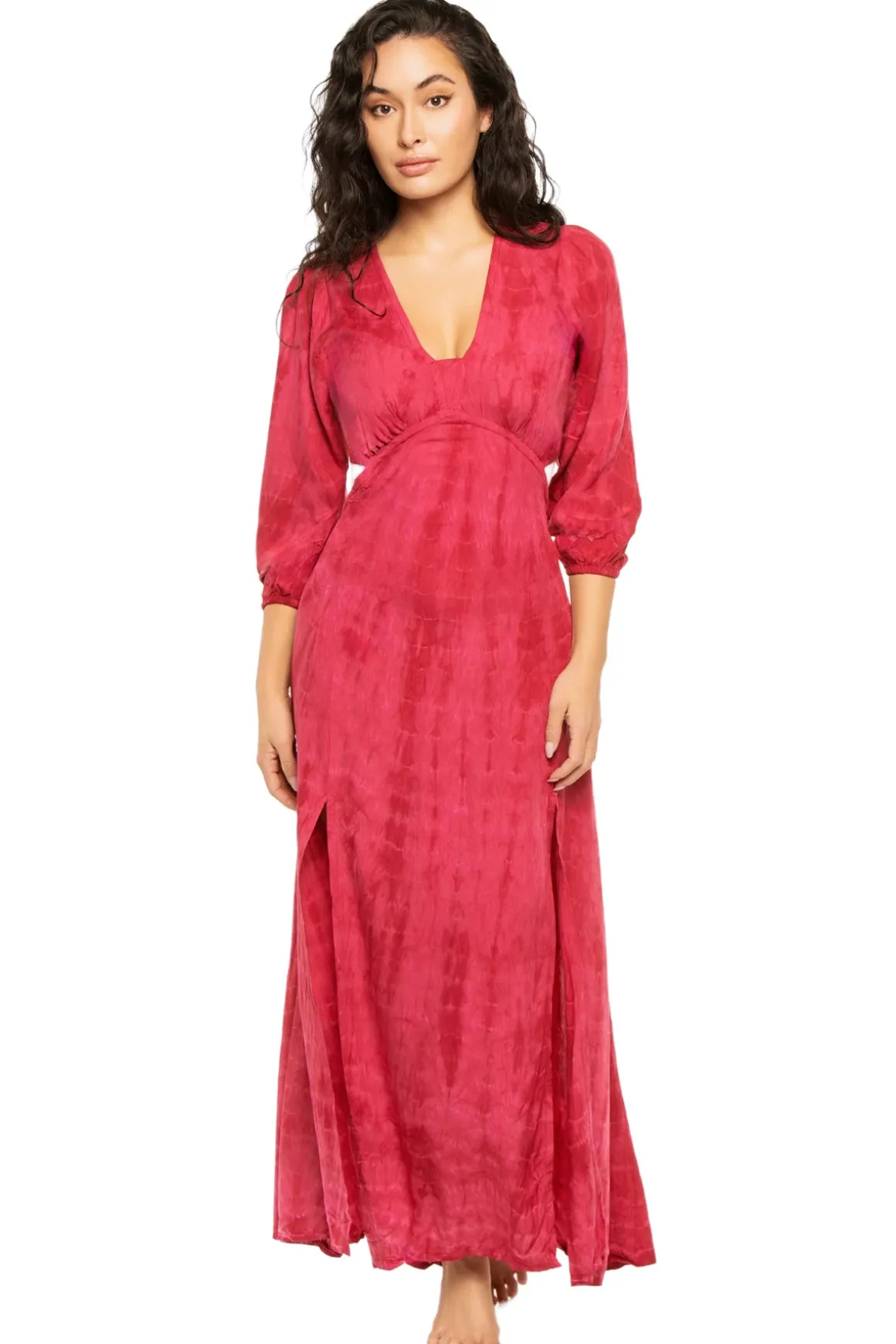 Sofia maxi dress features a plunging neckline with a gathered bust, three-quarter length sleeves, and a back cut out.