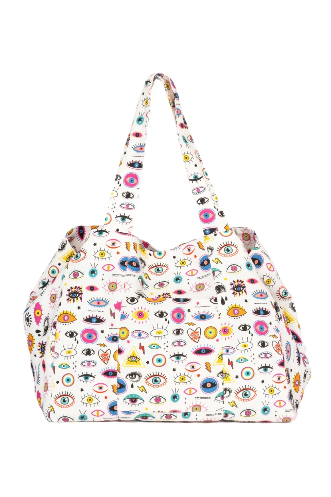 Starry eyes tote bag features evil eye printed canvas with soft dual drop handles and offers interior pockets.