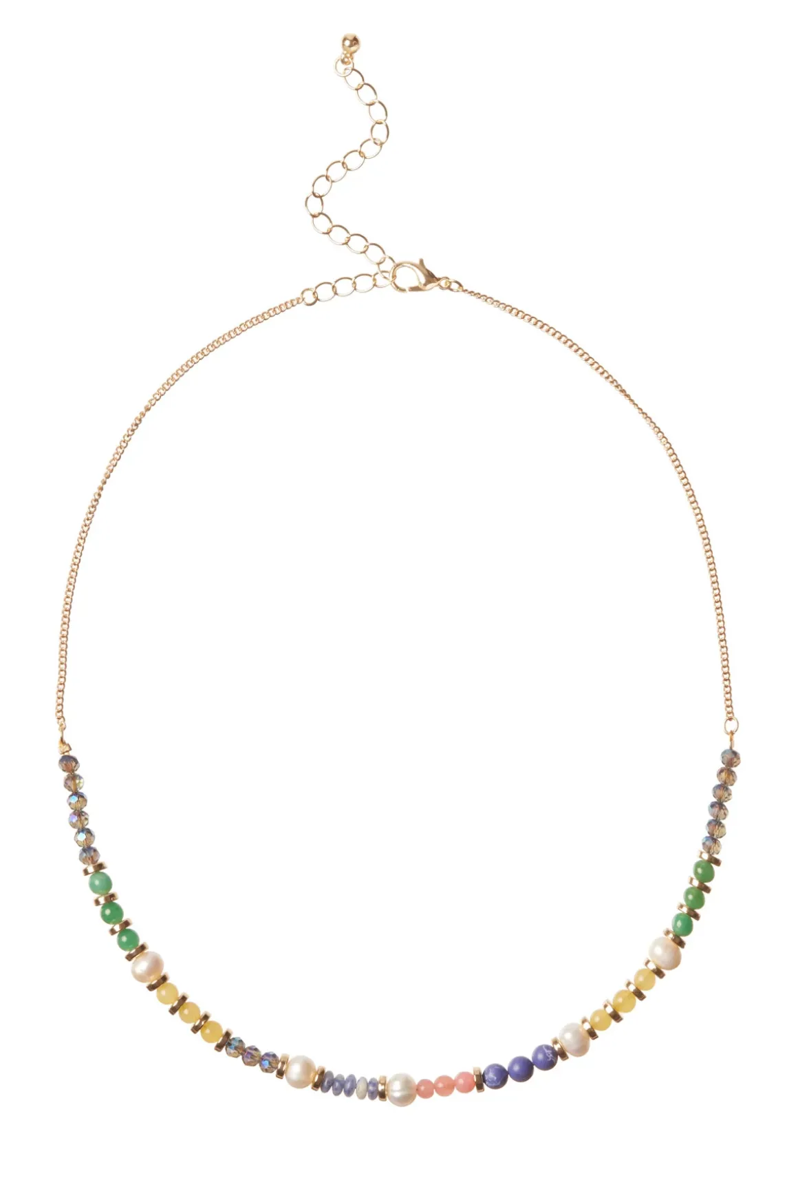 Necklace features a multicolored beaded chain with a lobster clasp closure.