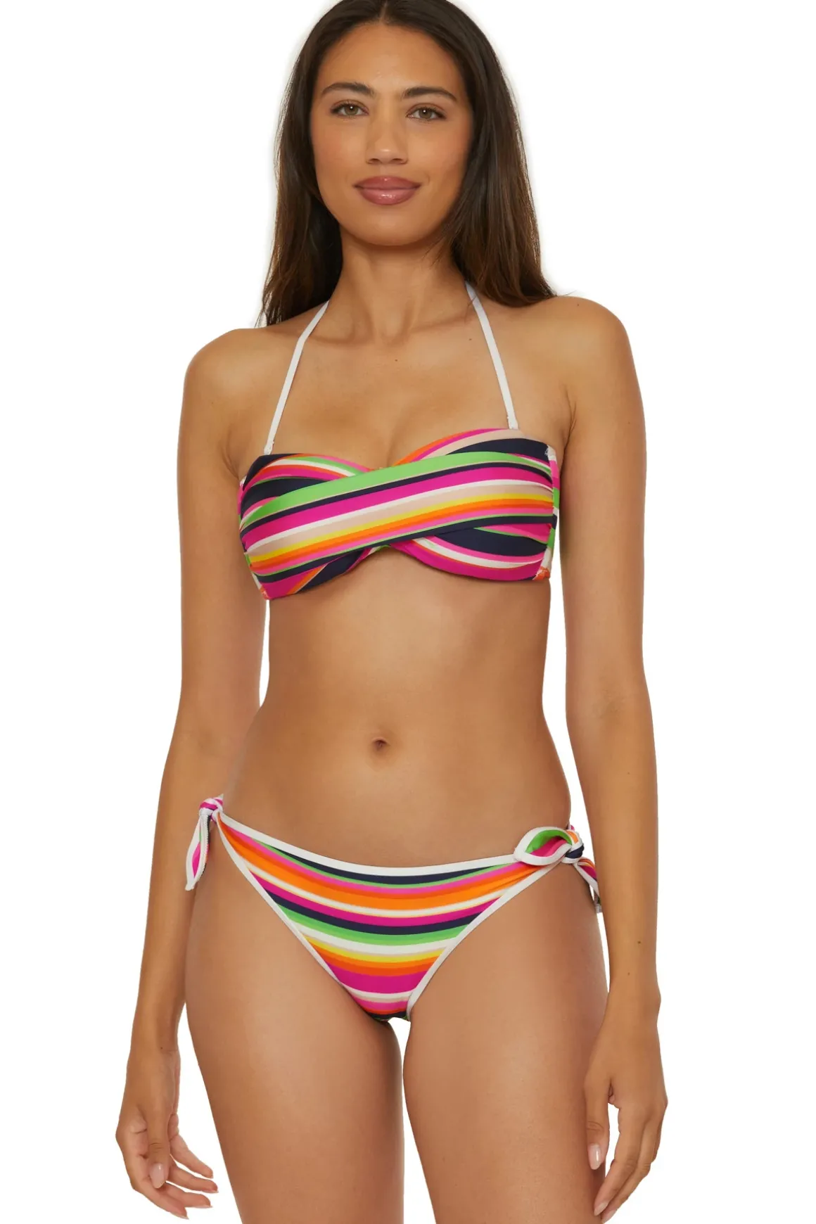 One piece features bold striped print and a cross over front detail. Offers molded cups, removable halter straps, and a tie back closure.