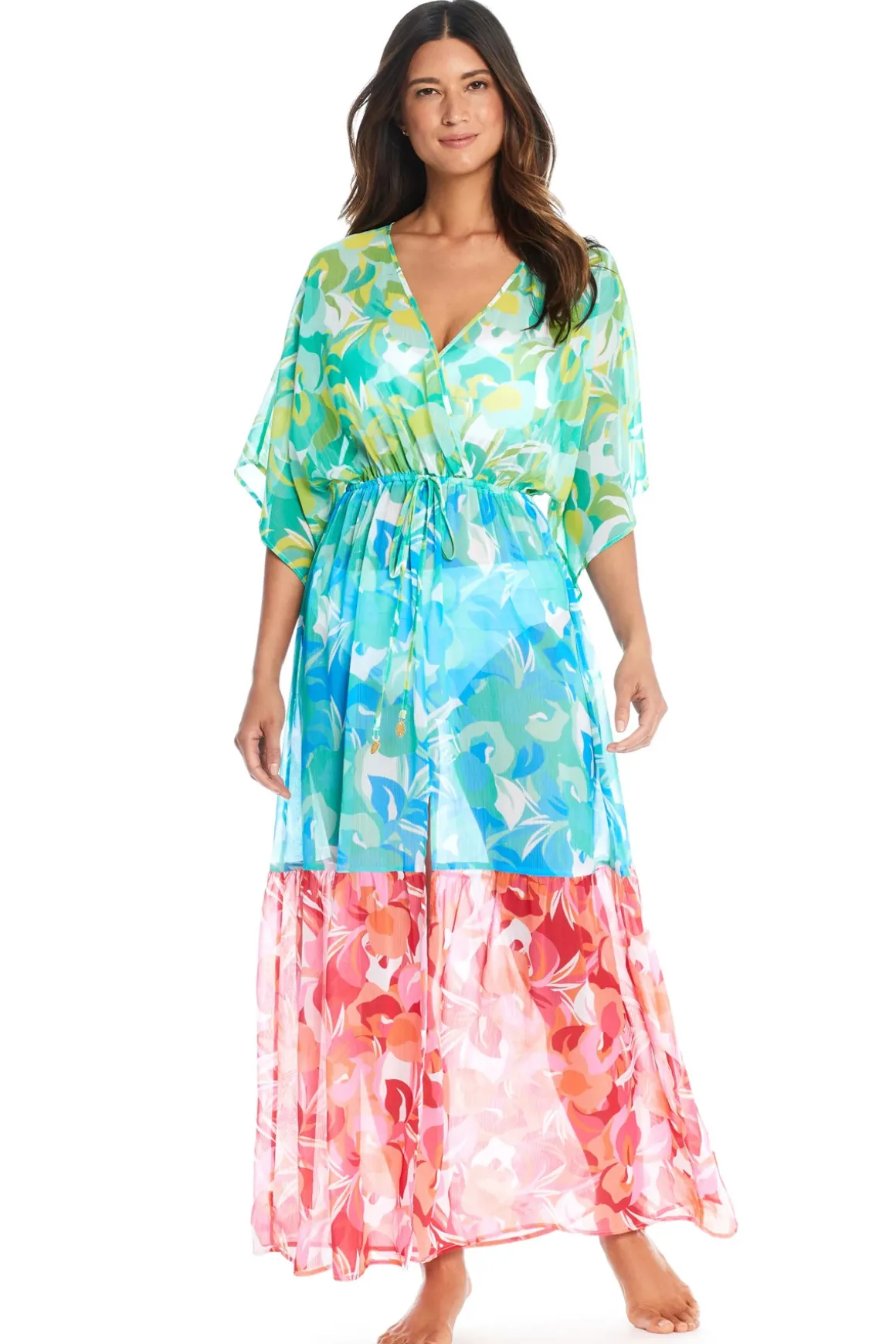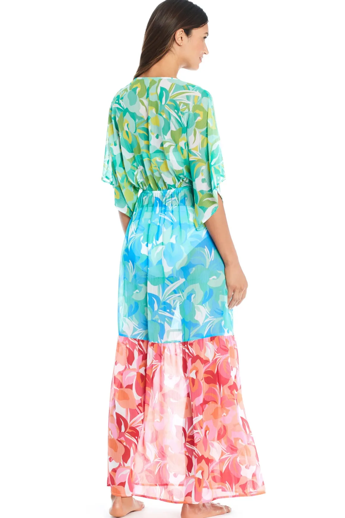 Maxi dress features a multi-color printed chiffon with a drawstring waistband.