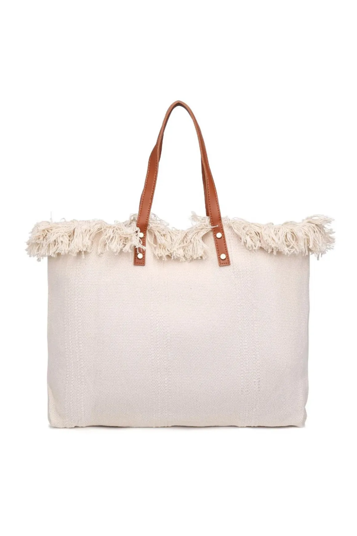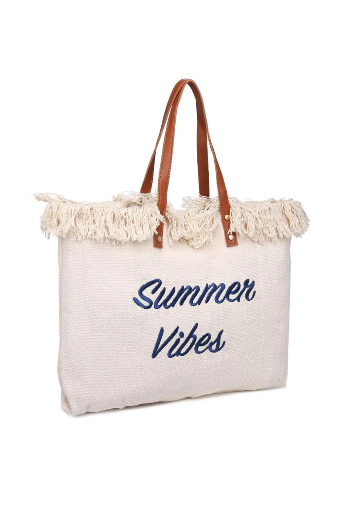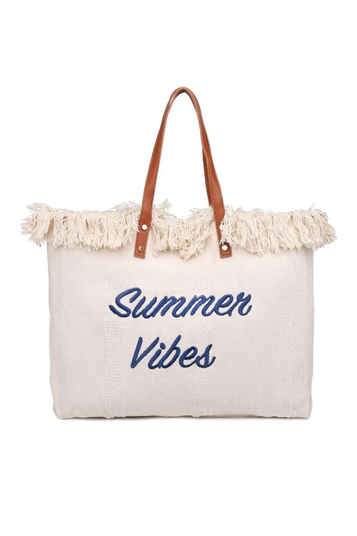 Straw tote bag features fringe trim, vegan leather top handles and a bold “Summer Vibes” script that captures the essence of sunny days.