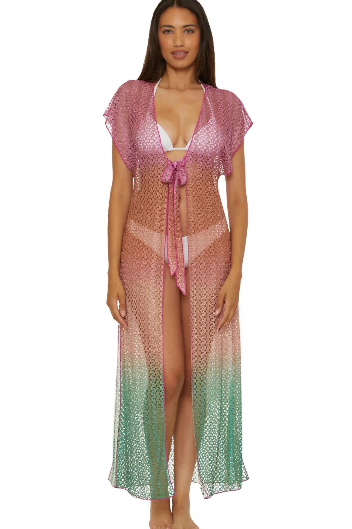 Ombre kimono features open weave crochet, short sleeves, and a tie front closure.