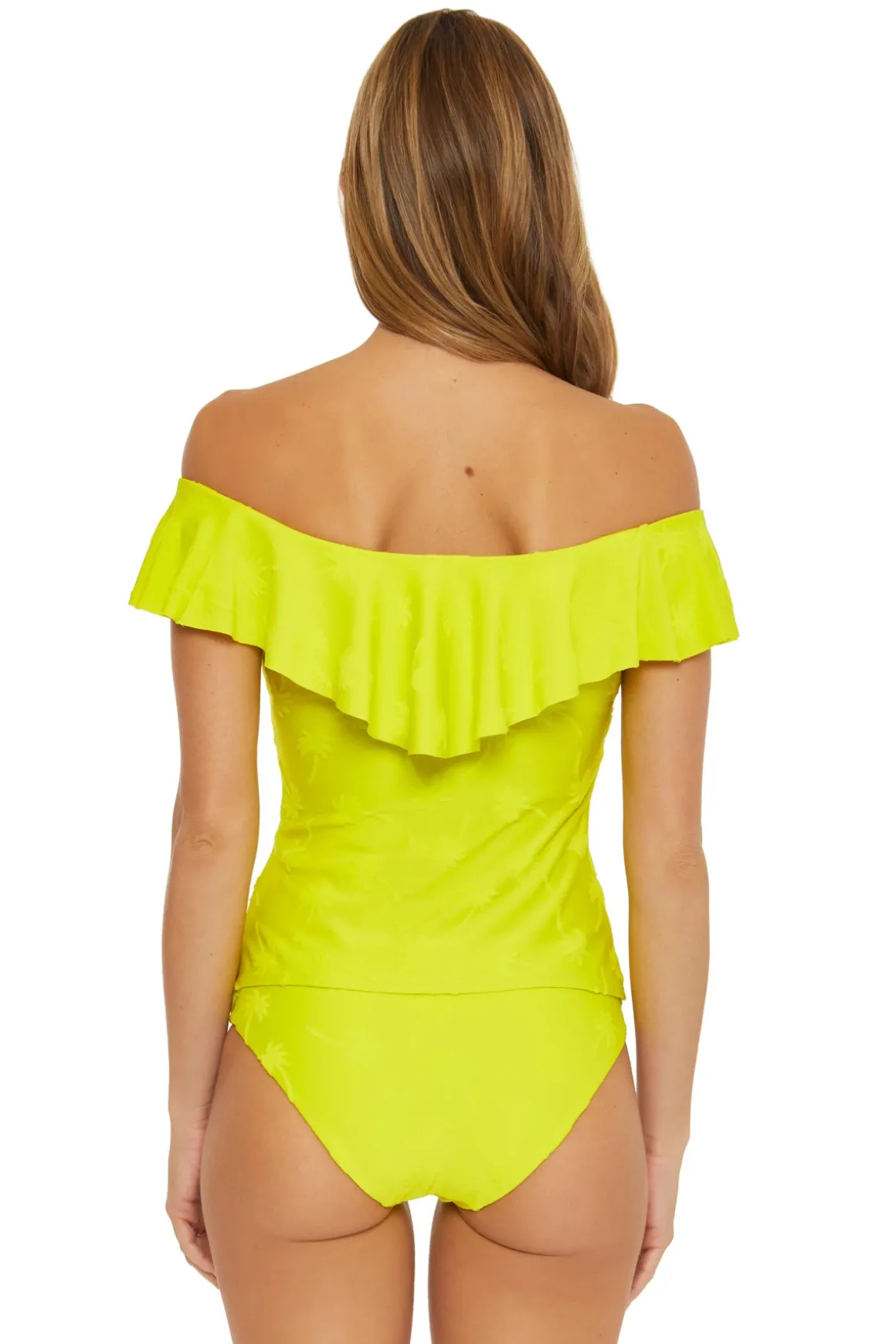 Sway bandeau tankini top features a jacquard palm tree texture with a ruffle overlay and offers a shelf bra with removable molded cups.
