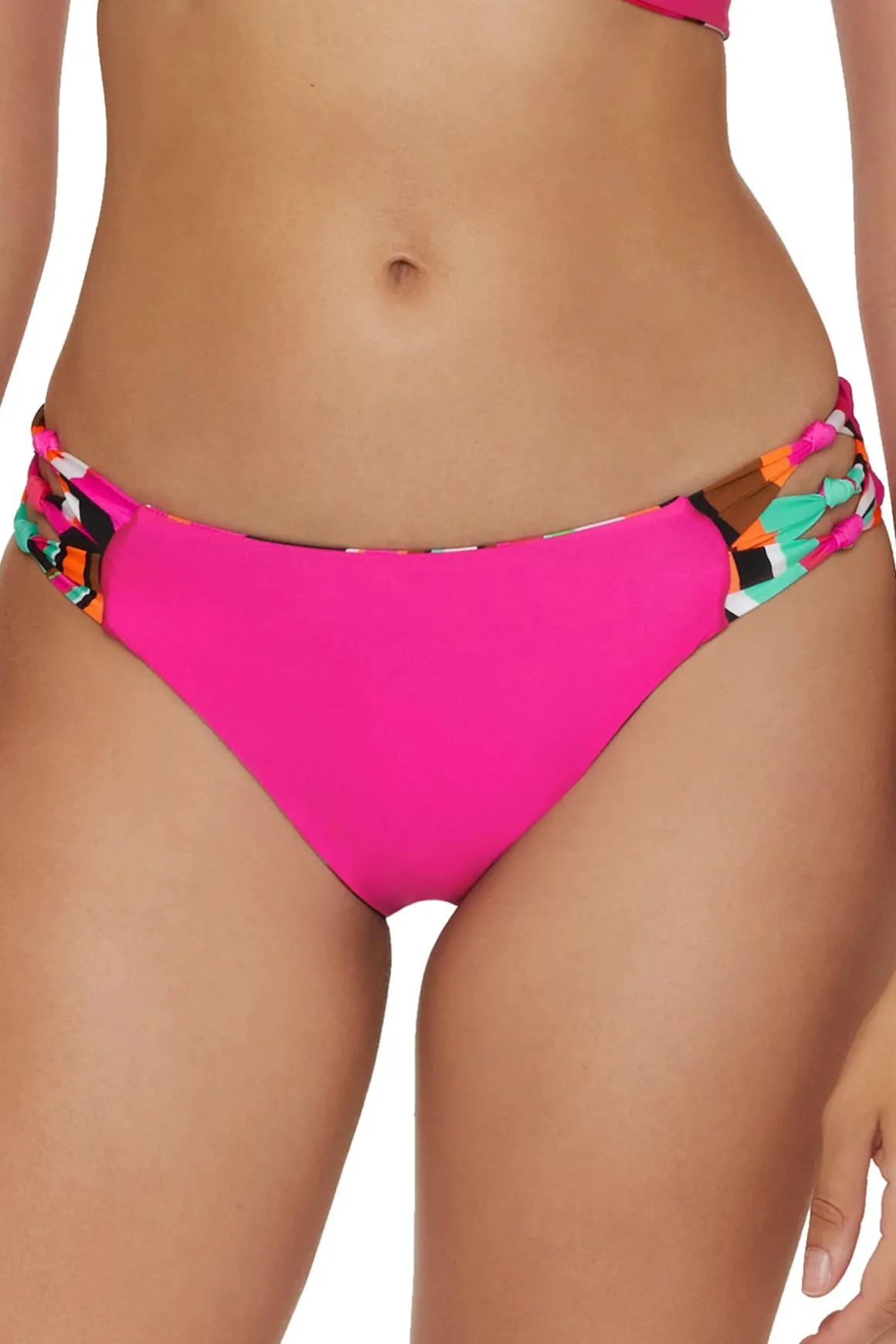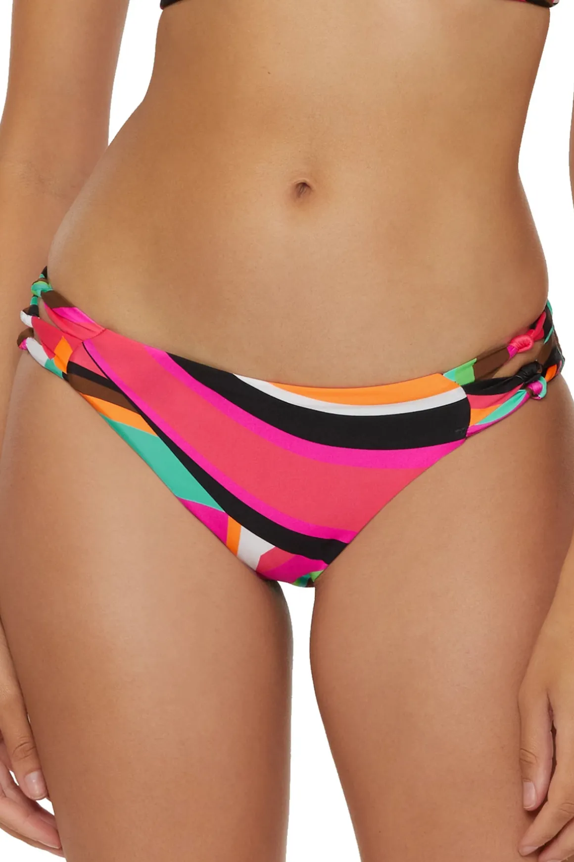 Hipster bikini bottom reverses from solid to a multicolor stripe pattern and features patterned knot details at the sides. Offers moderate coverage.