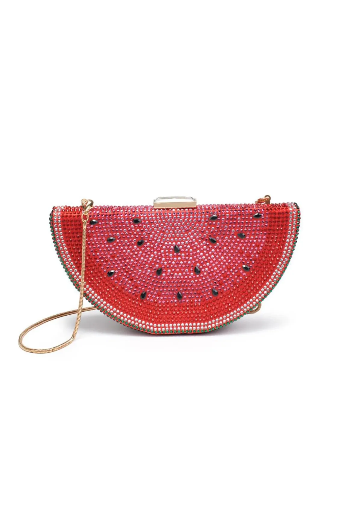 Tabitha clutch features eye-catching details, rhinestone embellishments, a detachable chain strap, and a top clasp closure.