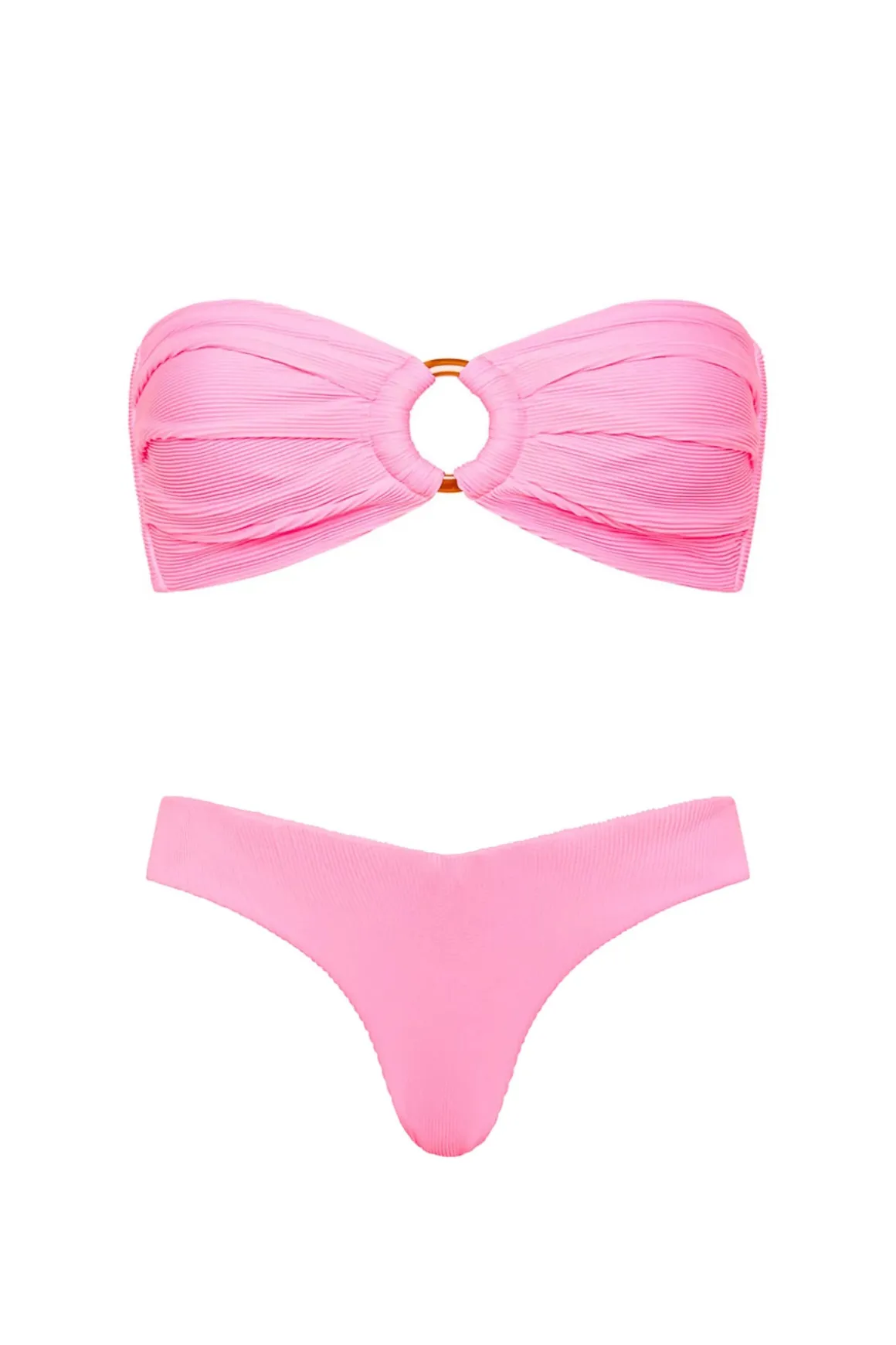 Taffy ribbed bikini top features pleat detailing, and a center ring detail. Offers side boning and an adjustable tie back closure.