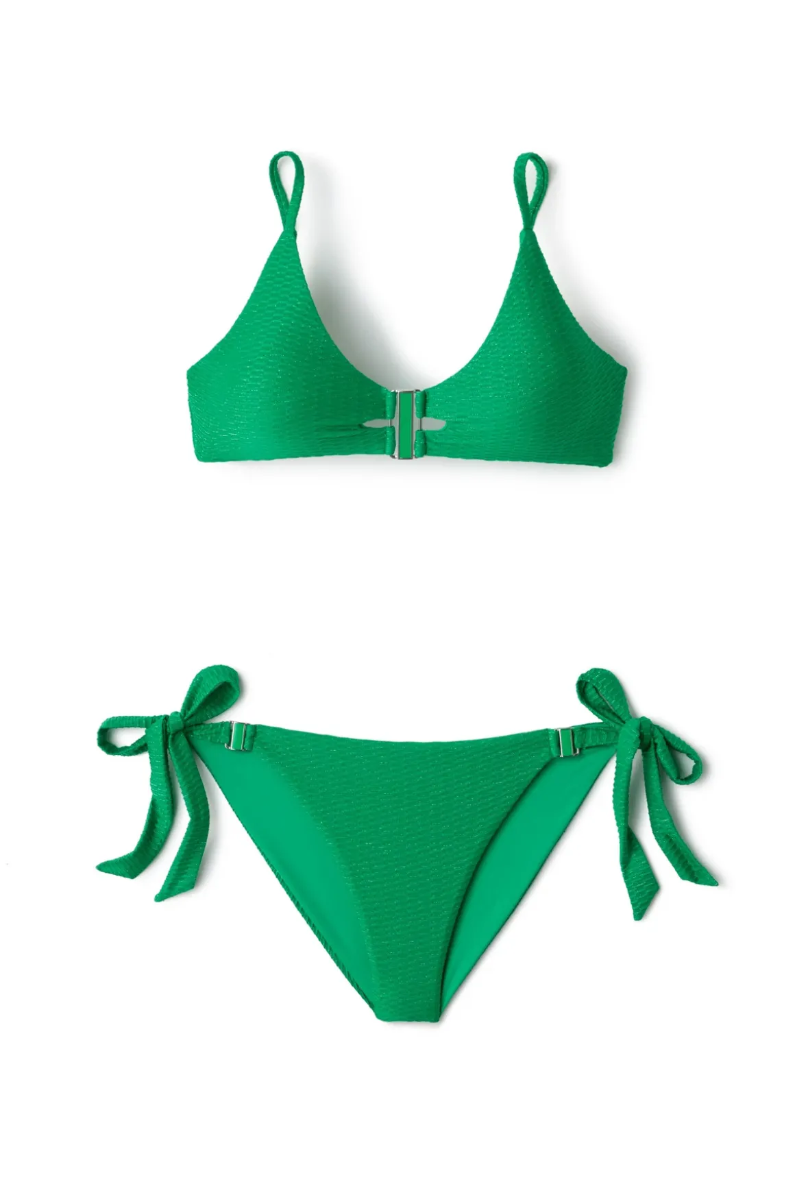 Tatum textured bralette bikini top features silver metallic detailing and silver square buckle with inlay matching enamel. Can be worn multiple ways to suit your style. Offers removable soft cups and tie closure.