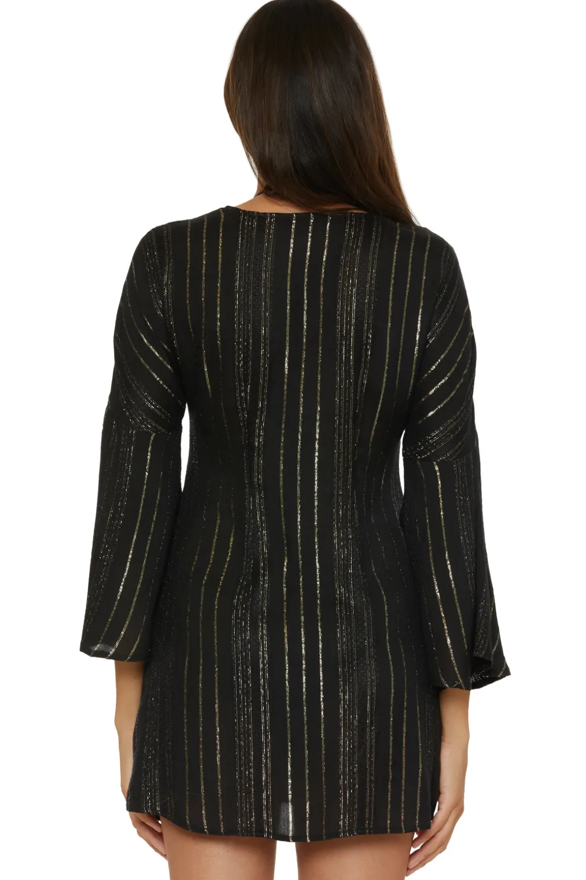 Shimmery chiffon tunic offers 3/4 sleeves and a tie front closure.
