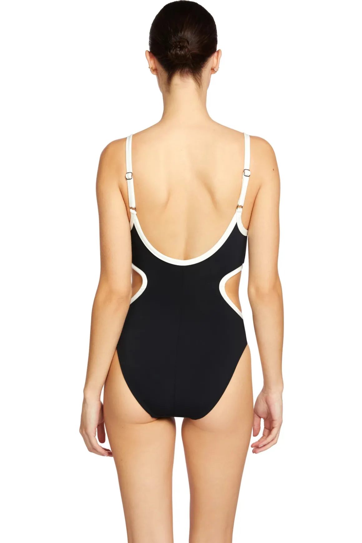 One piece swimsuit features side cut out details accented with rope ties. Offers adjustable straps, moderate bottom coverage and a high leg design.