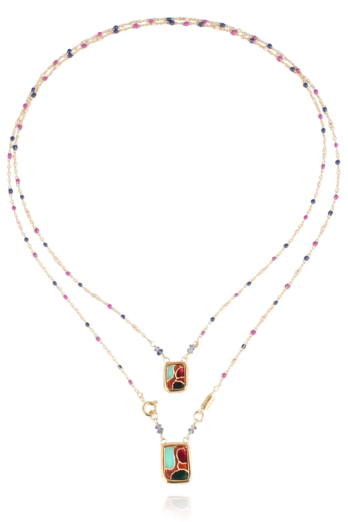 Totem scapulaire necklace is composed of a dainty beaded chain adorned with two hand enameled medallions.