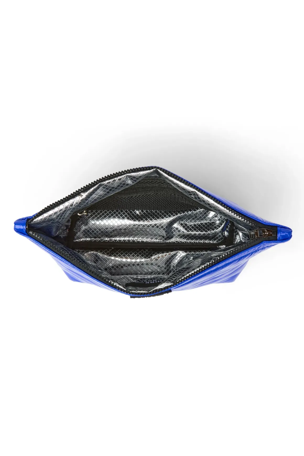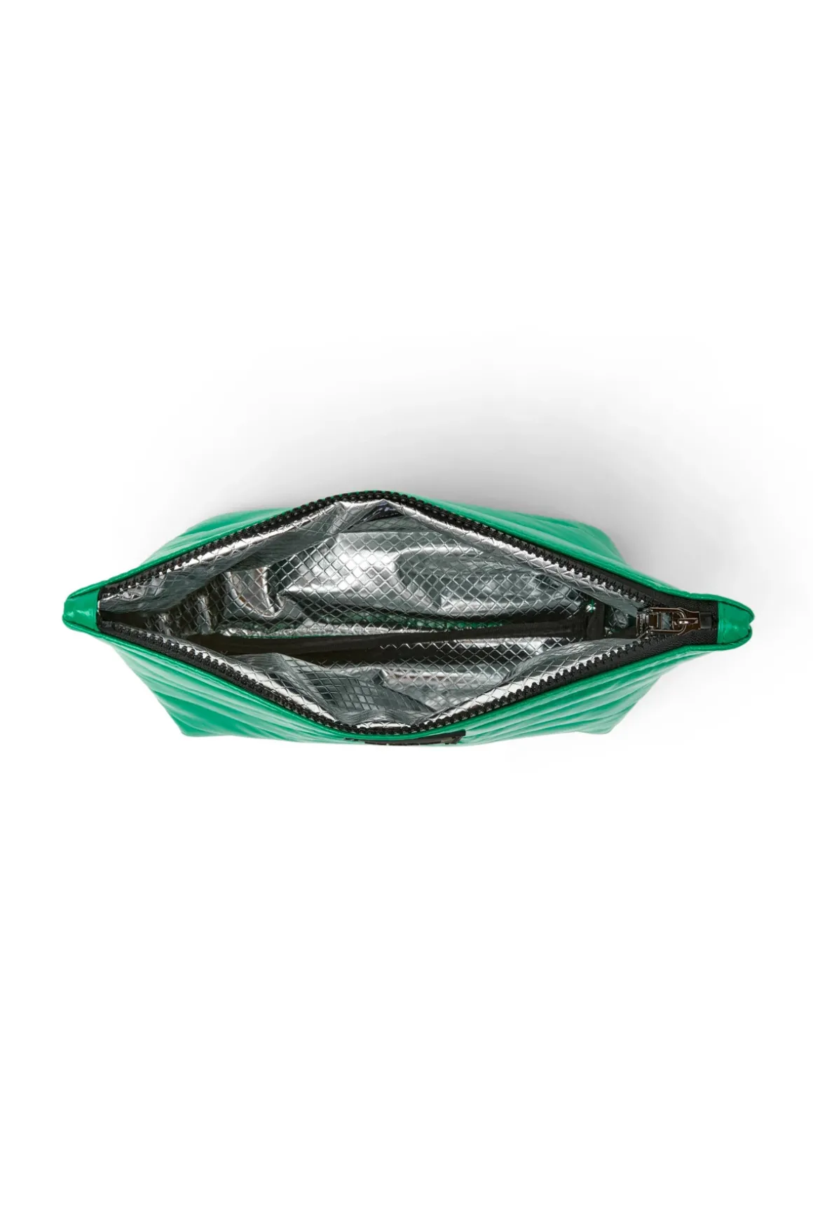 Pouches feature a quilted exterior, lined with a silver foil finish, rubber patch on the front, and a top zipper closure.