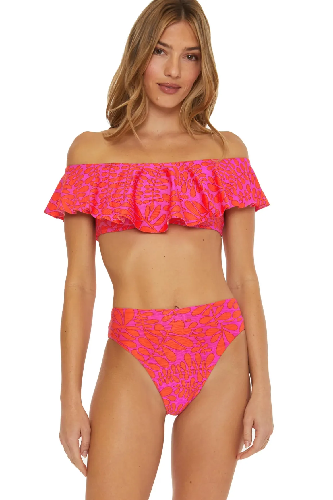 Trellis bandeau bikini top features a textured tropical print with a ruffle overlay and offers a shelf bra with removable cups and a pull over fit.