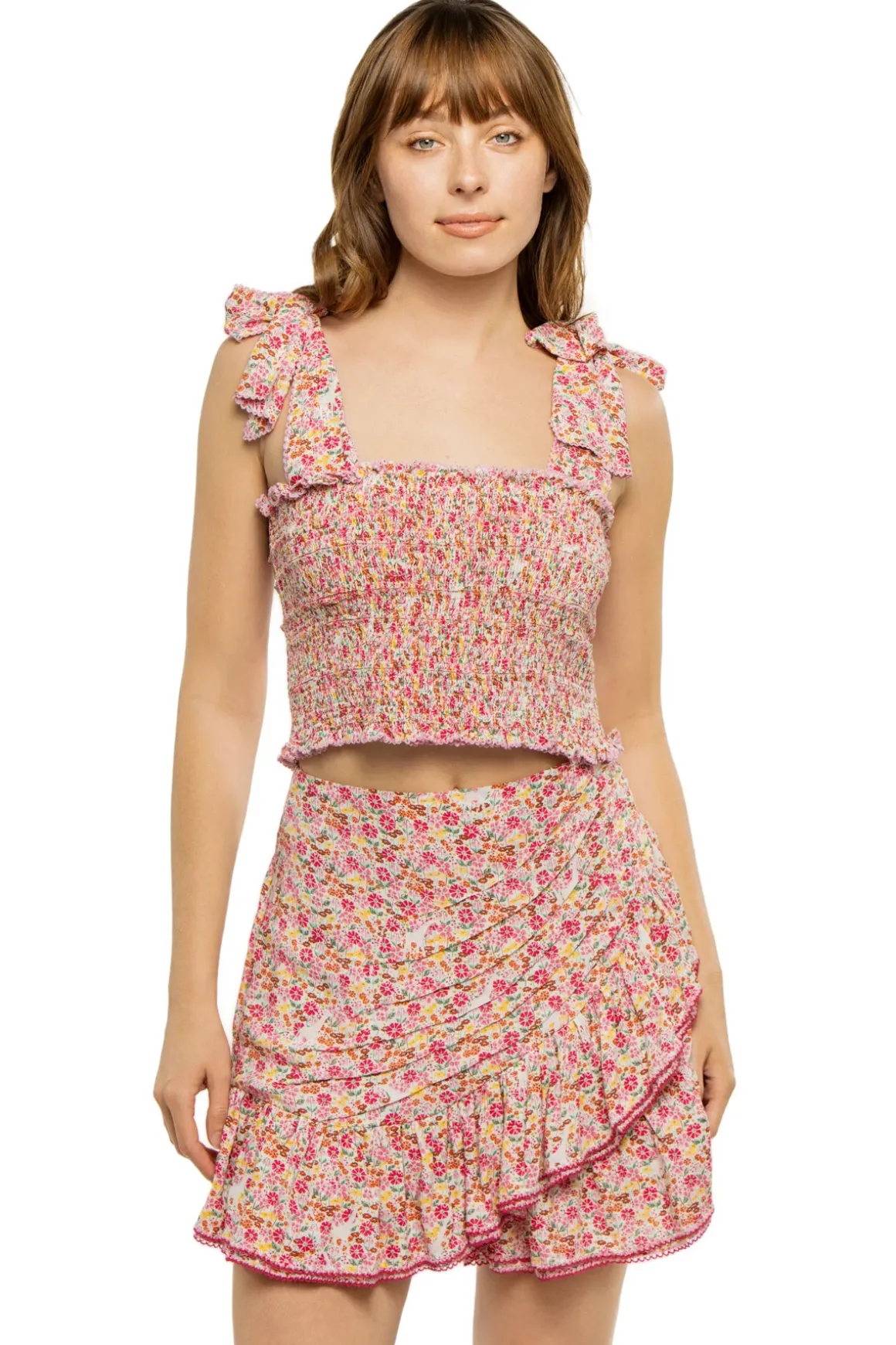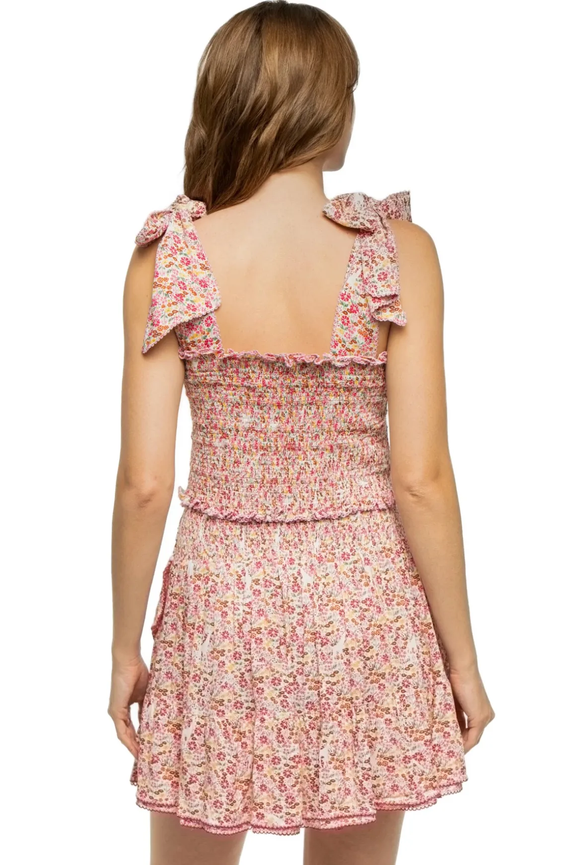 Triny crop top features adelightful floral print, smocked bodice, square neckline, and wide straps that tie at the shoulder, revealing a bow-like detail.