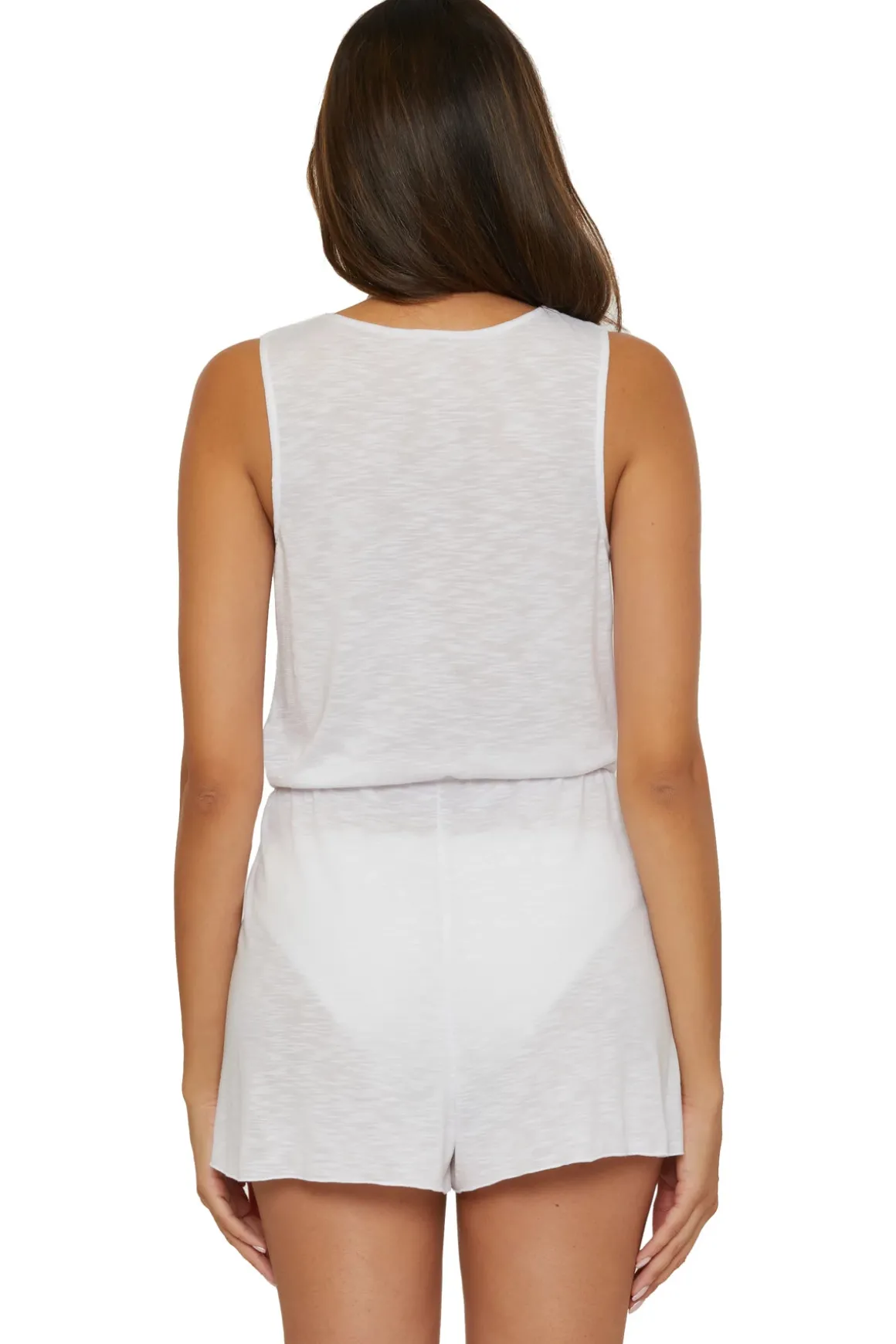 Romper features a v-neck surplice neckline, wrap front shorts, and a drawstring tie waist.