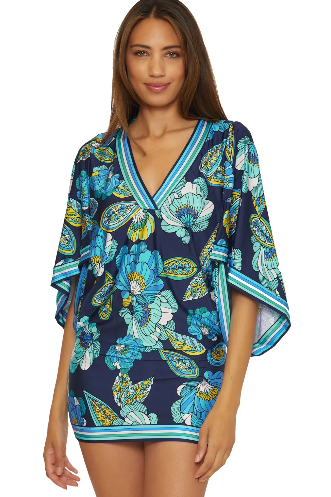 Tunic features a paisley floral print with contrast striped border along the wide 3/4 sleeves, v-neckline and hem.