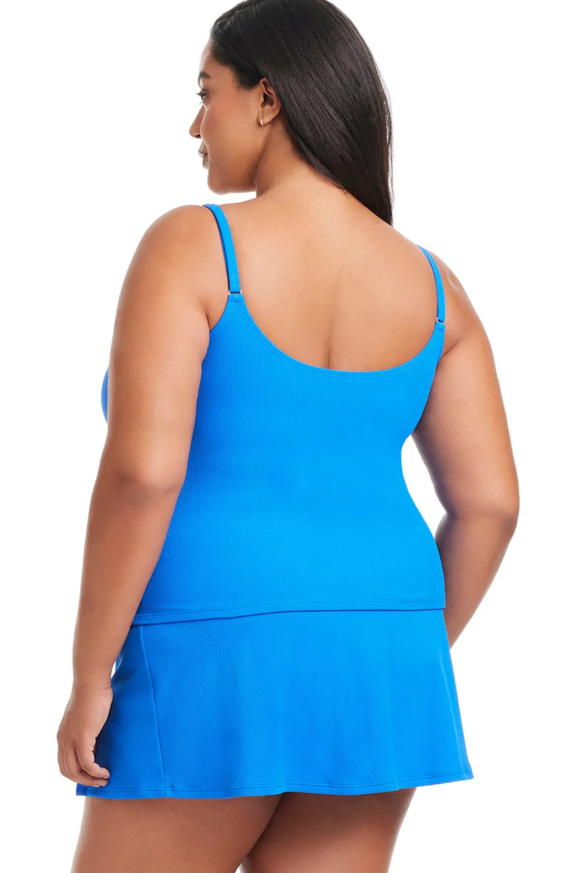 Tankini top feature textured fabric, v-neckline, floating underwire and adjustable straps with chain link details.