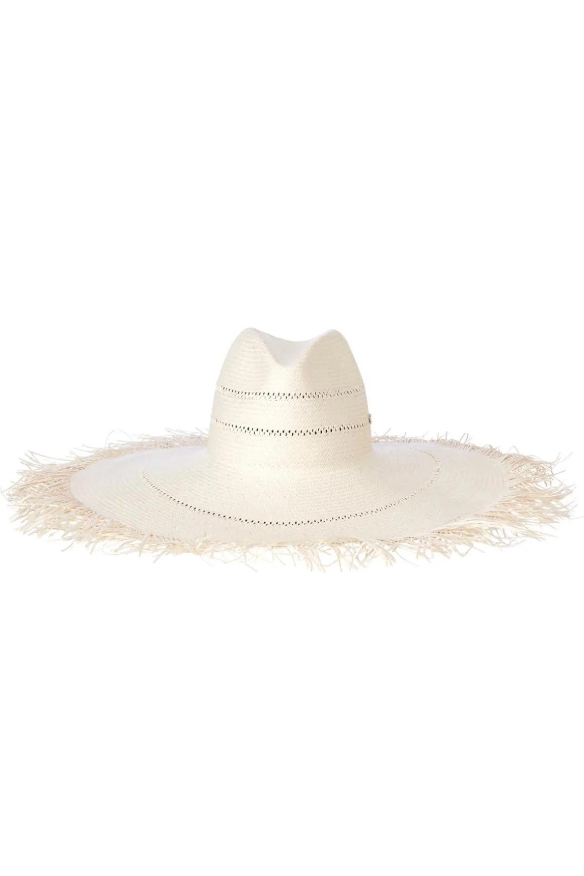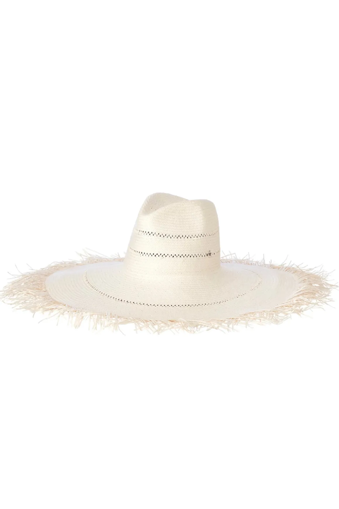 Valentina panama hat is handwoven from toyo straw and features frayed trim and an adjustable drawstring for a comfortable fit.