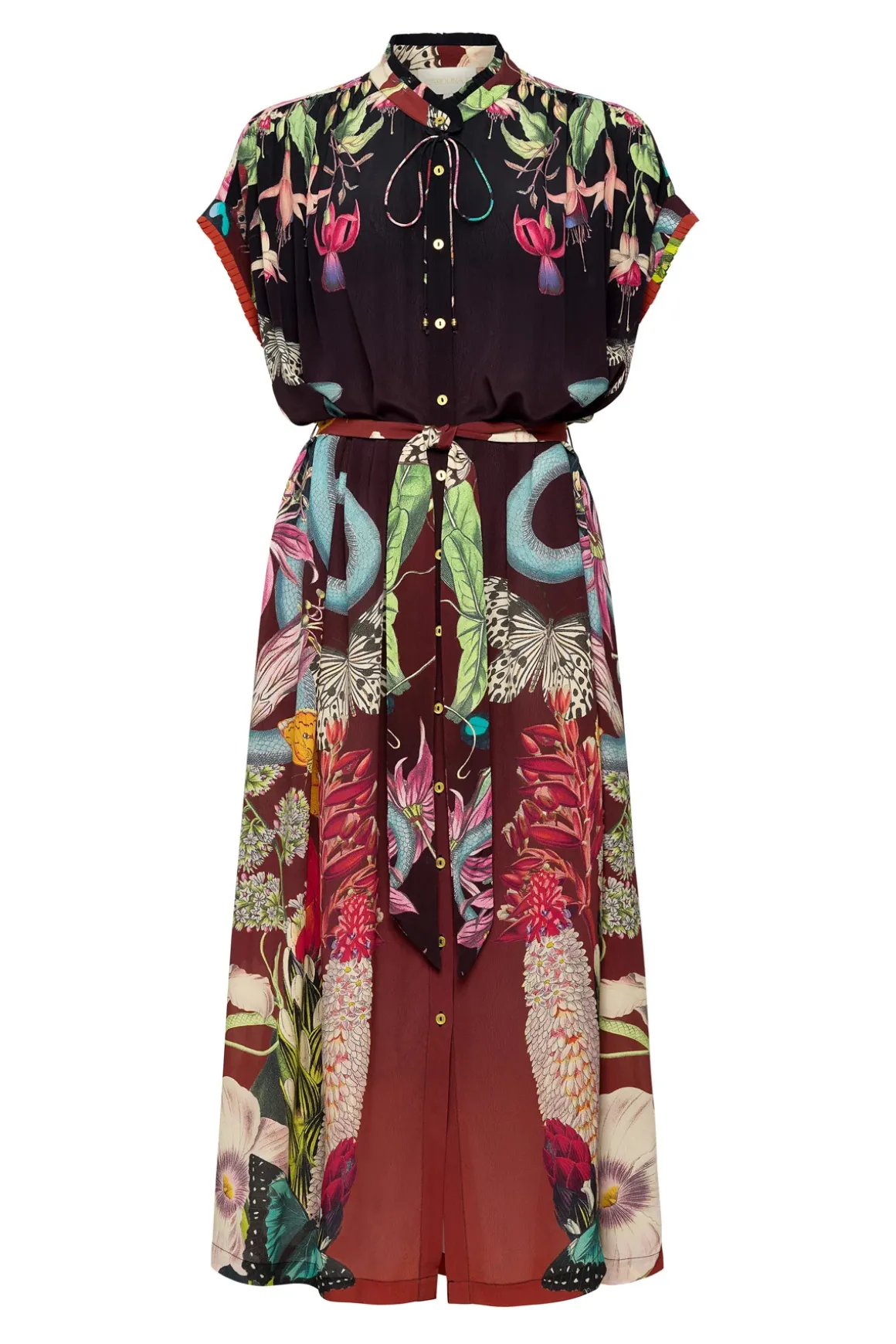 Valerie midi caftan dress features floral print with butterfly accents and offers a collared neckline, button closure and tie waist.