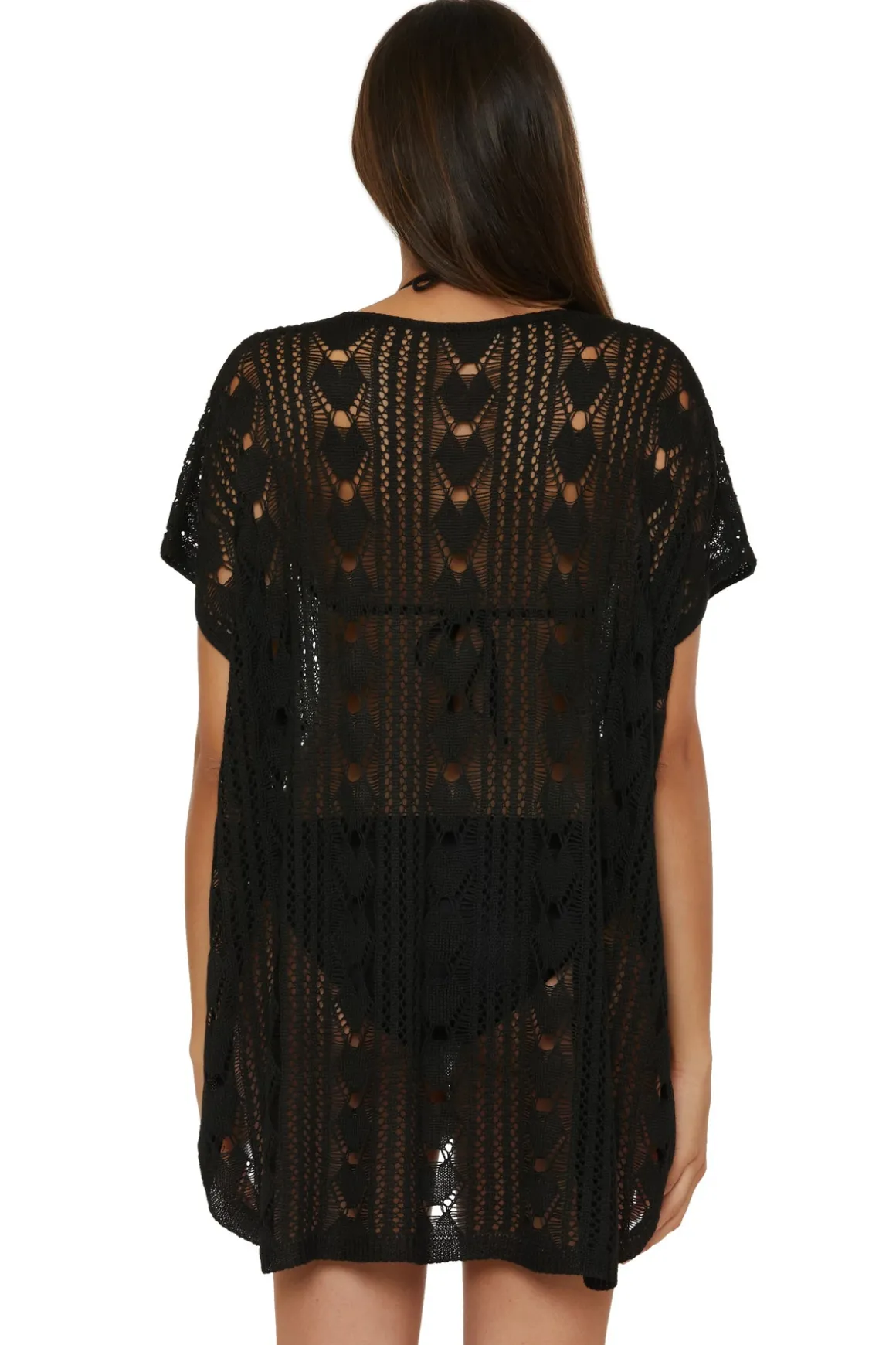 Venica tunic features intricate open weave crochet, a high-low hem and short sleeves.
