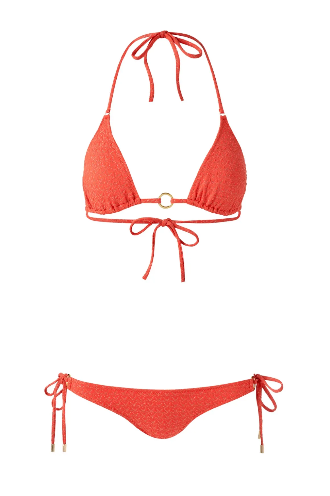 Venice triangle bikini top features a zig zag textured fabric with a ring detail and offers adjustable ties at neck and back.