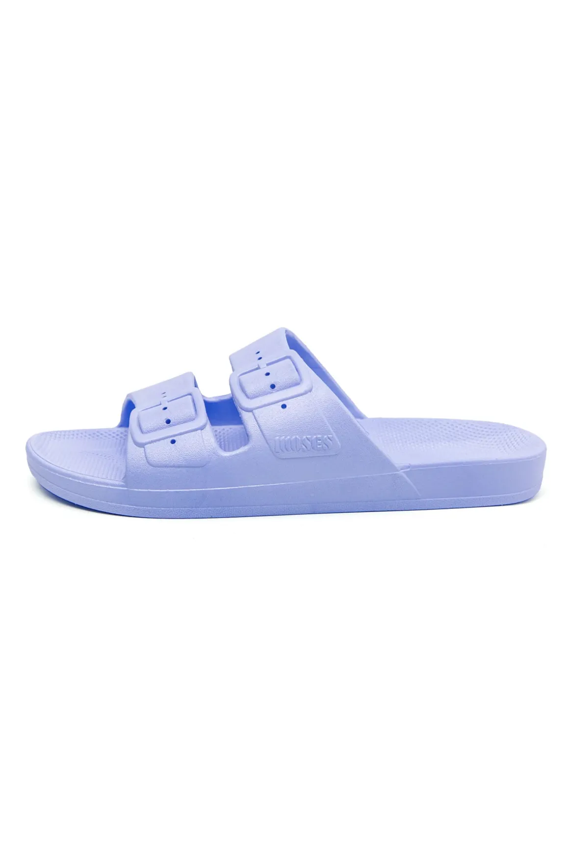 Waterproof Slides are vegan and recyclable slides that are injected with air and feature double wide crossover straps with faux buckles.