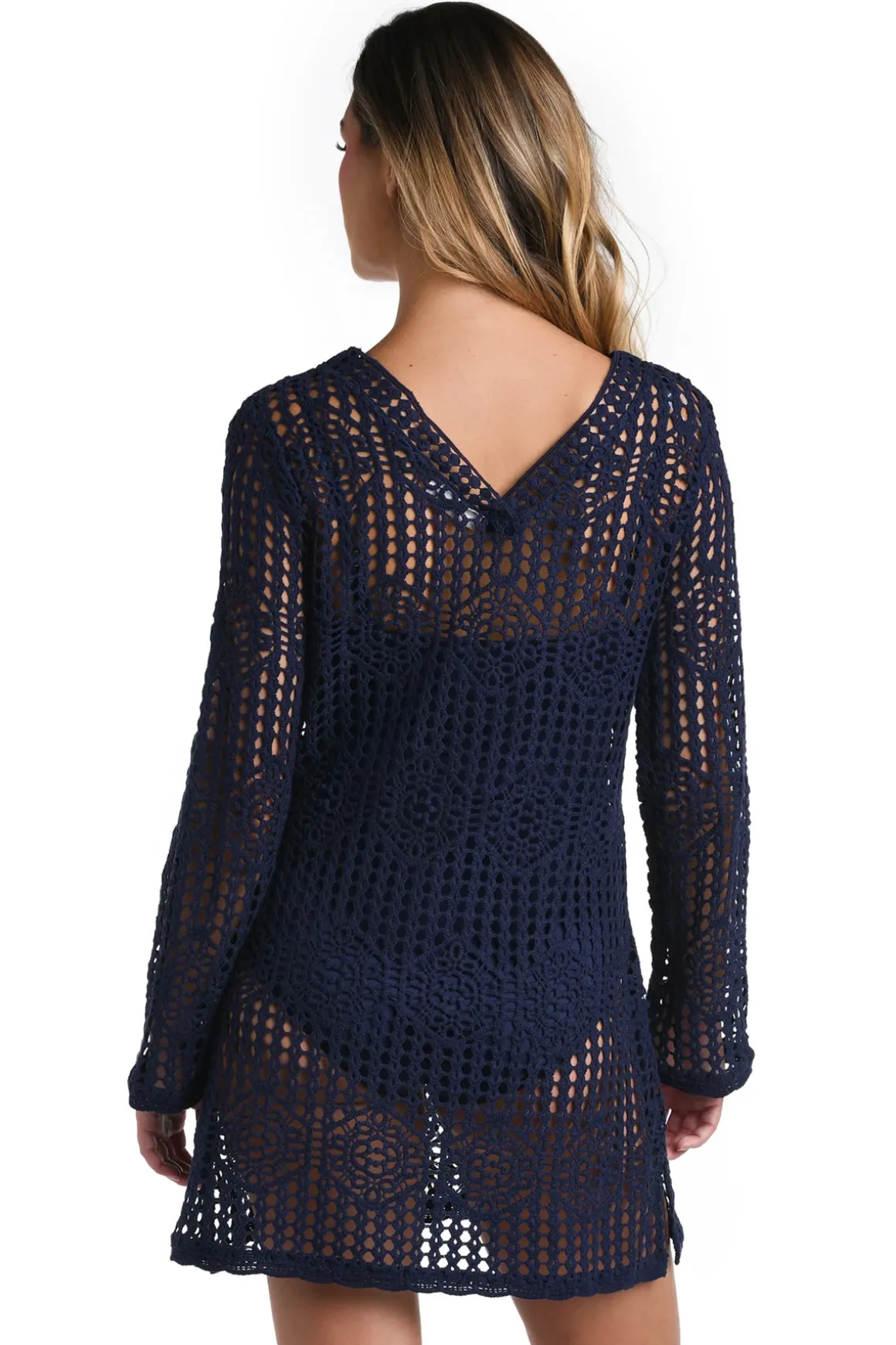 Waverly tunic features a detailed crochet fabric with a v-neckline and bell sleeves.