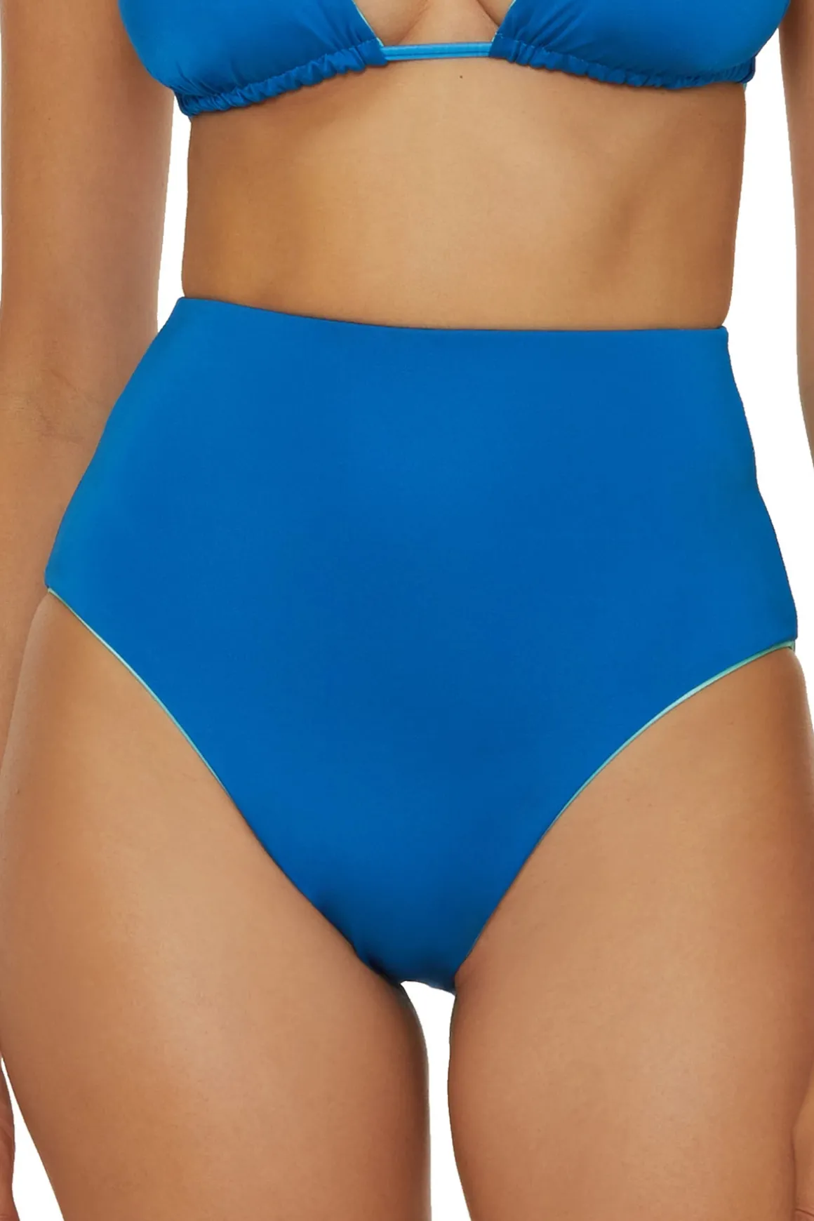 Bikini bottom features ombre high-shine liquid fabric that reverses to a solid and moderate bottom coverage.