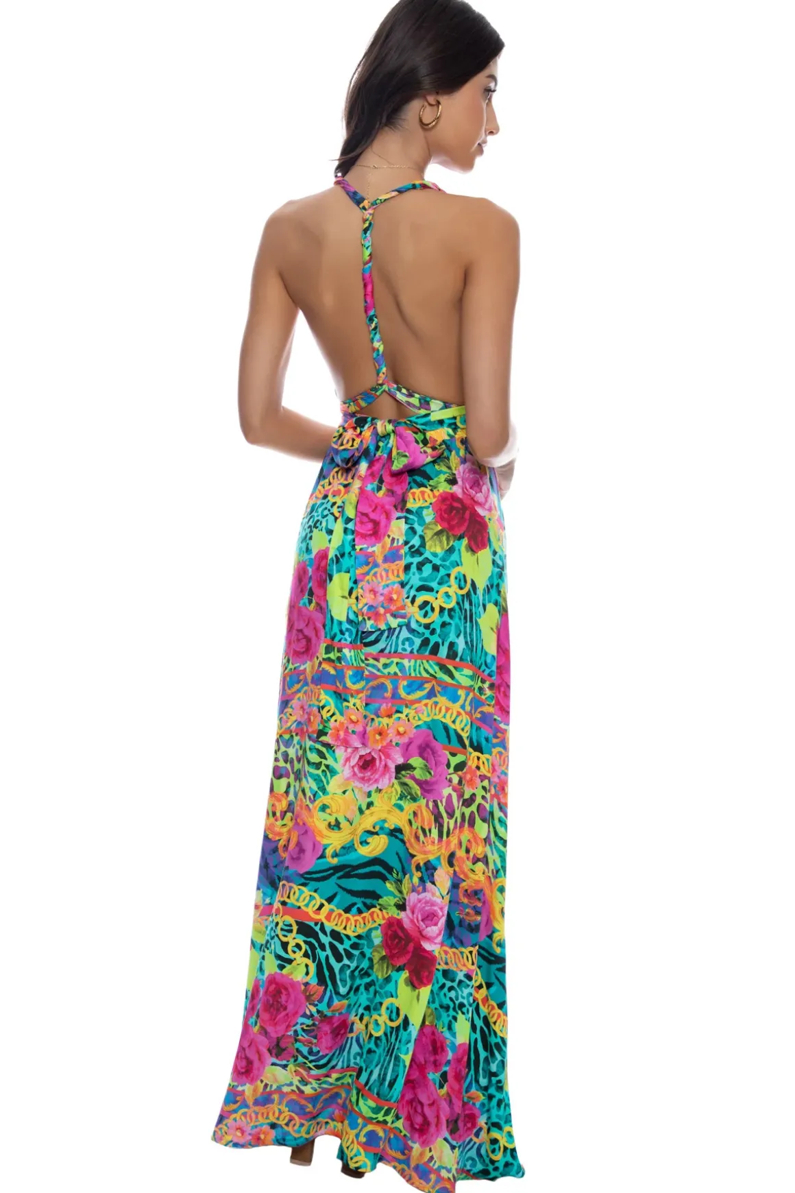 Maxi dress features bright floral print, a plunge neckline, shirred waist and an ultra flowy silhouette.