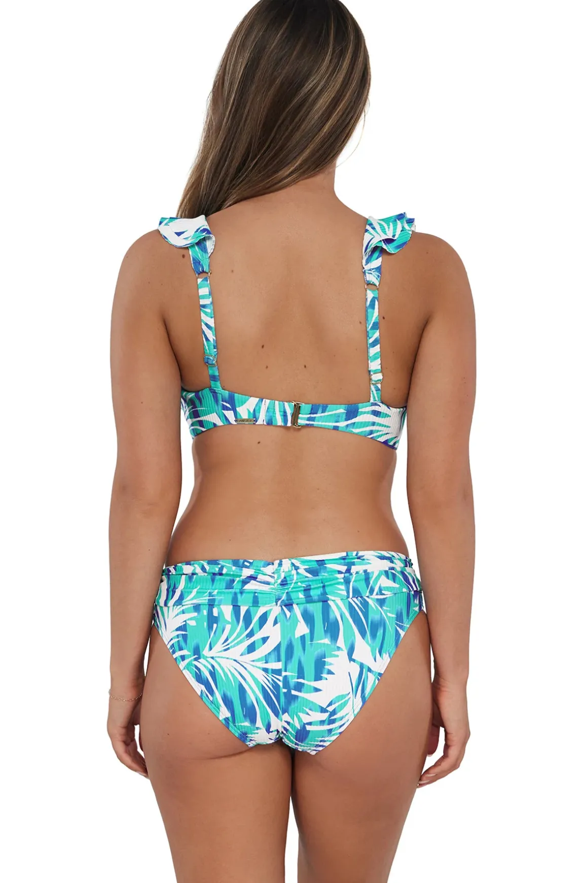 Willa wireless bikini top features wide shoulder straps and a soft underbust band for all-day comfort. A powermesh sling, boning, and j-hook provide extra support, while adjustable straps ensure a perfect fit. Delicate ruffles along the neckline add a feminine touch, and removable cups offer customizable coverage