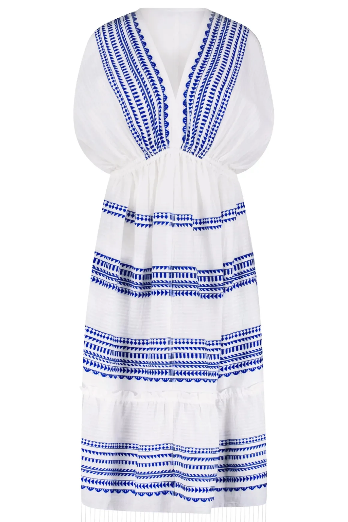 Yani midi dress features an intricate Tibeb pattern on textured fabric made by the most skilled artisans. Offers a plunging neckline, caftan sleeves, an elastic waist and a side slit skirt with a raw fringe hem.