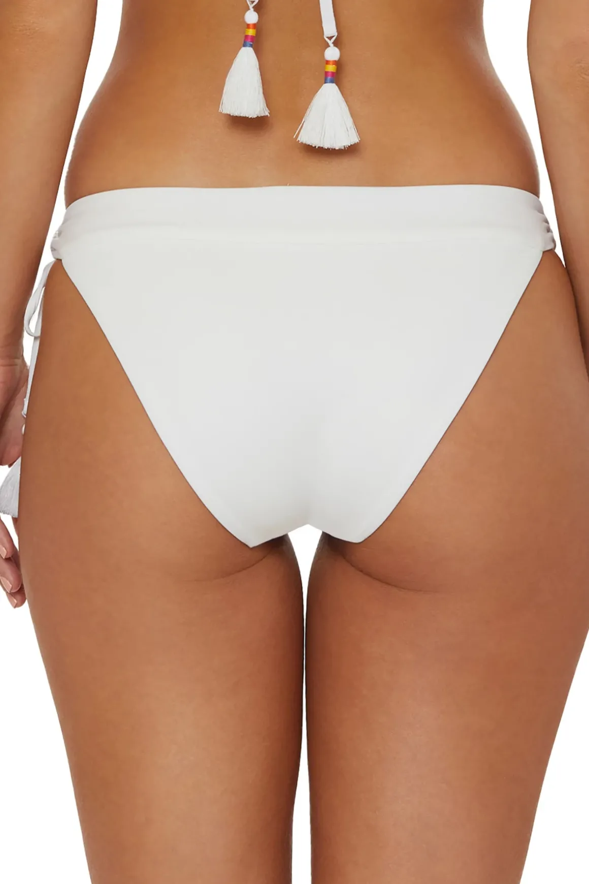 Bikini bottom features floral crochet accents and adjustable looped tie sides adorned with thread wrapped tassels. Offers moderate coverage.
