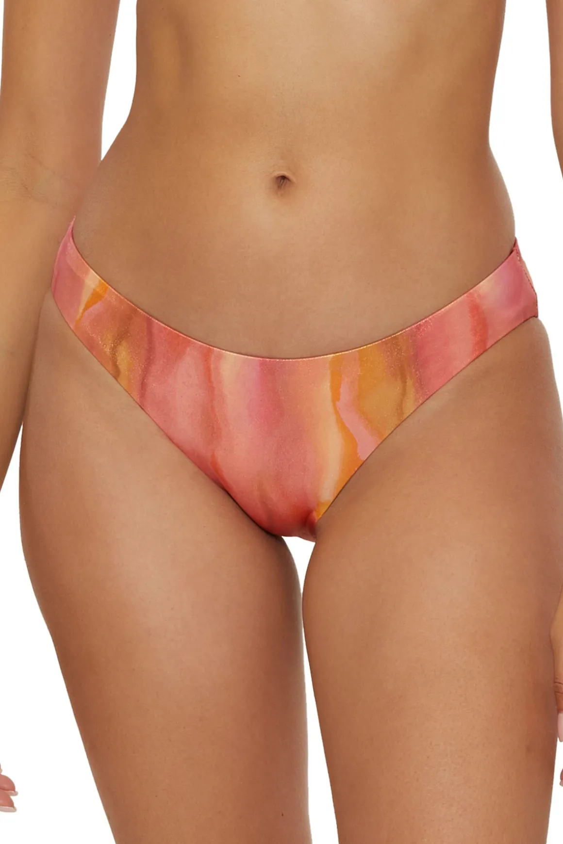 Adela hipster bikini bottom features gold foil dusting on a tie-dye wash design and offers moderate coverage.