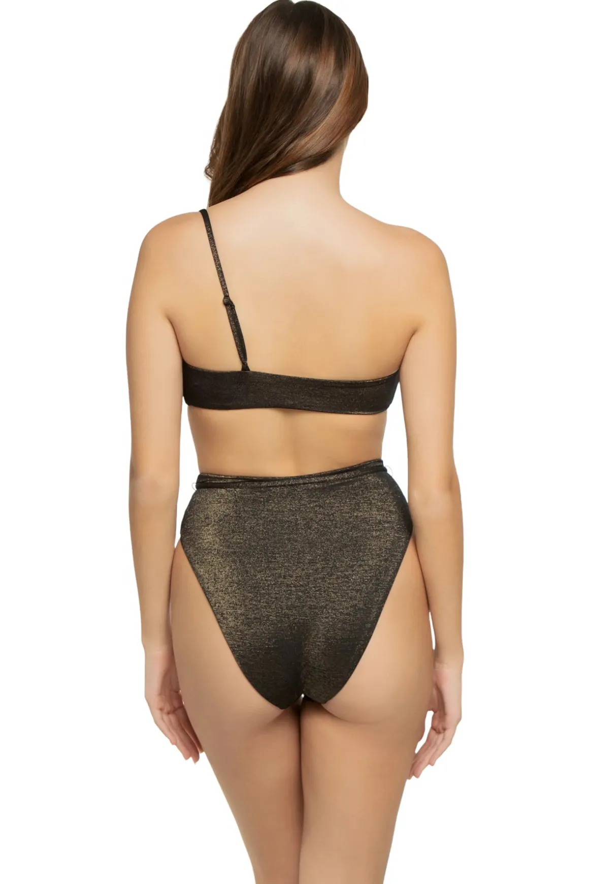 Alaia bikini top features textured shimmer fabric and a one shoulder adjustable strap with rectangular hardware accent.