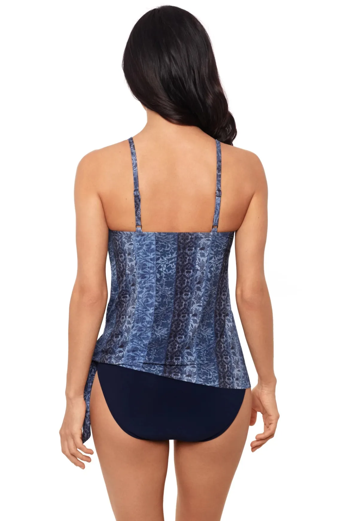 Alex tankini top features a v-neckline, adjustable straps, removable soft cups, underwire support, and an adjustable side tie detail.