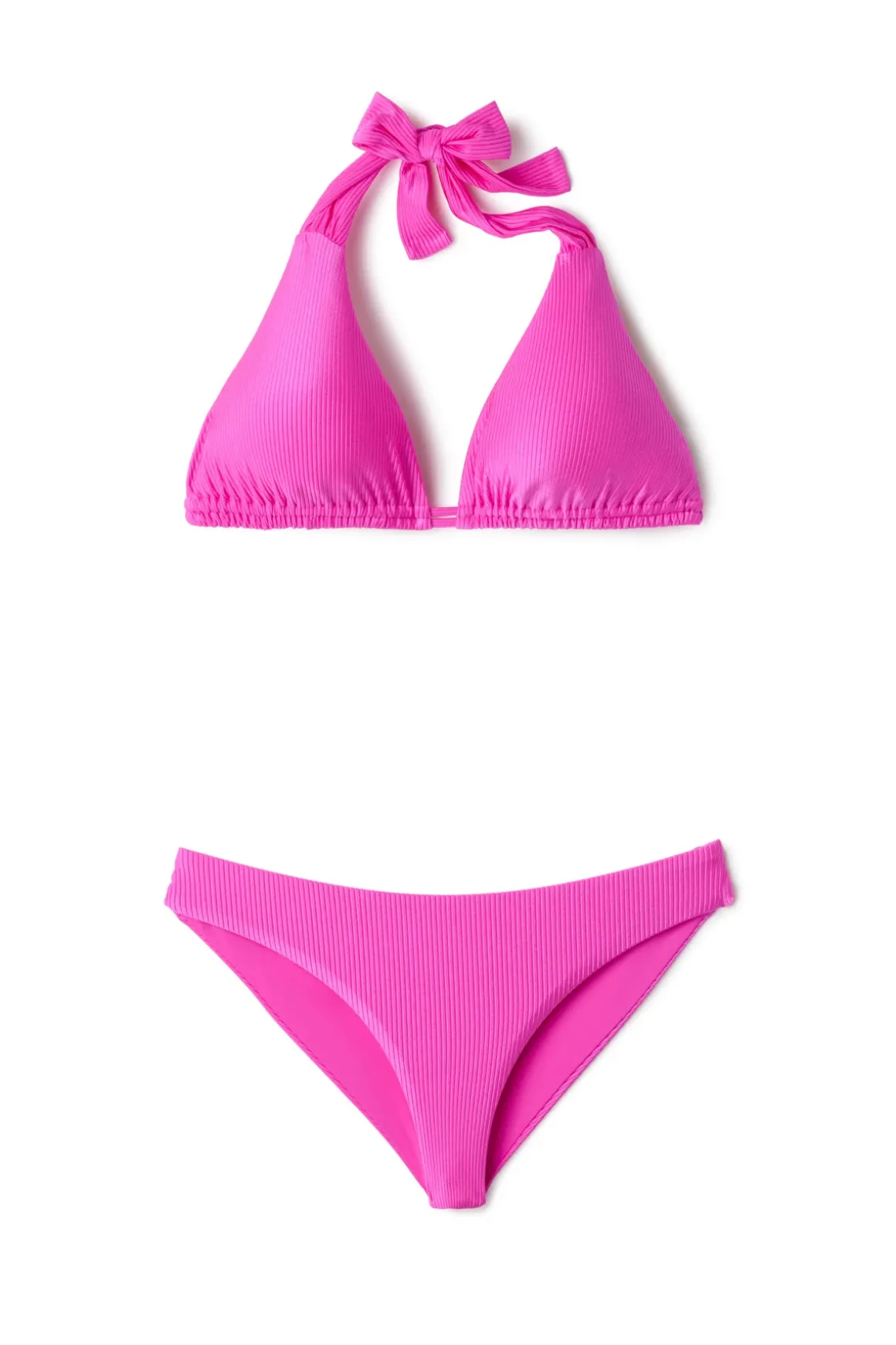 Allie shiny ribbed halter bikini top features double under bust ties for additional support. Offers removable soft cups and adjustable straps.