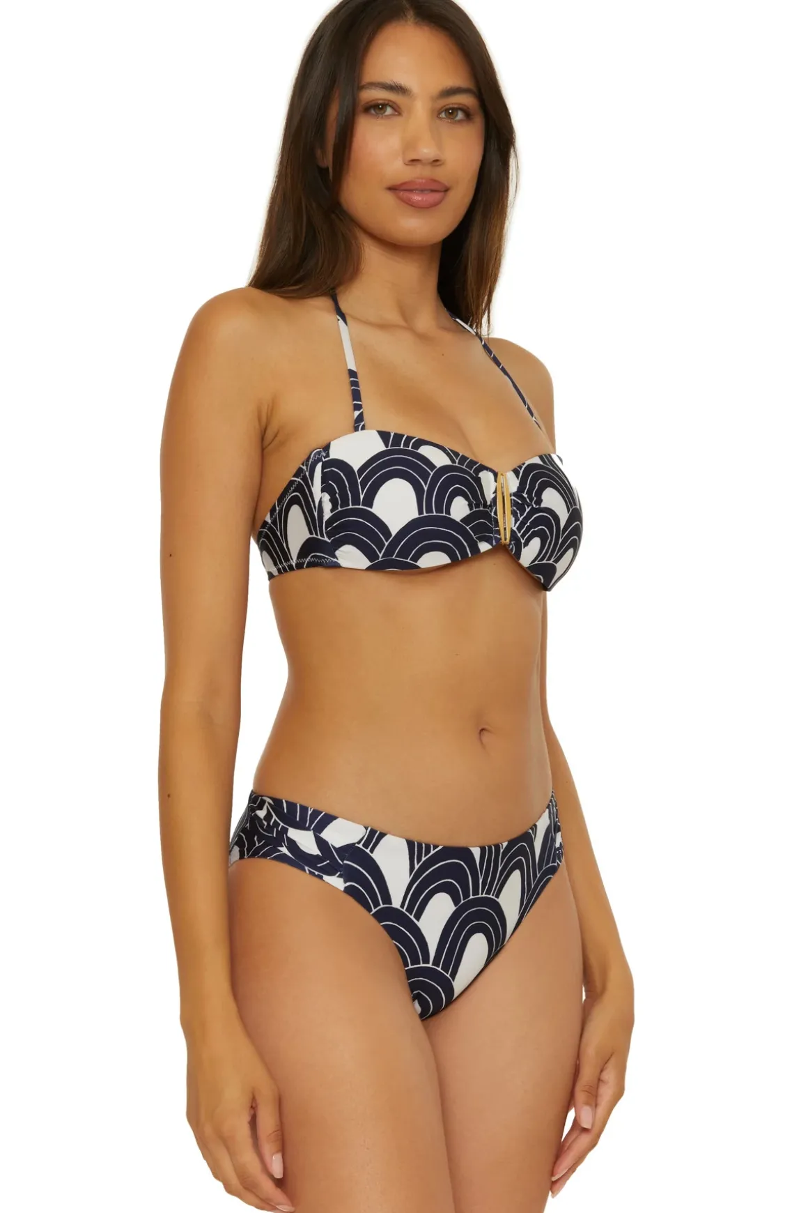 Bikini top features a gold plated hardware accent and offers molded cups and removable halter ties with gold plated beads and tassels.