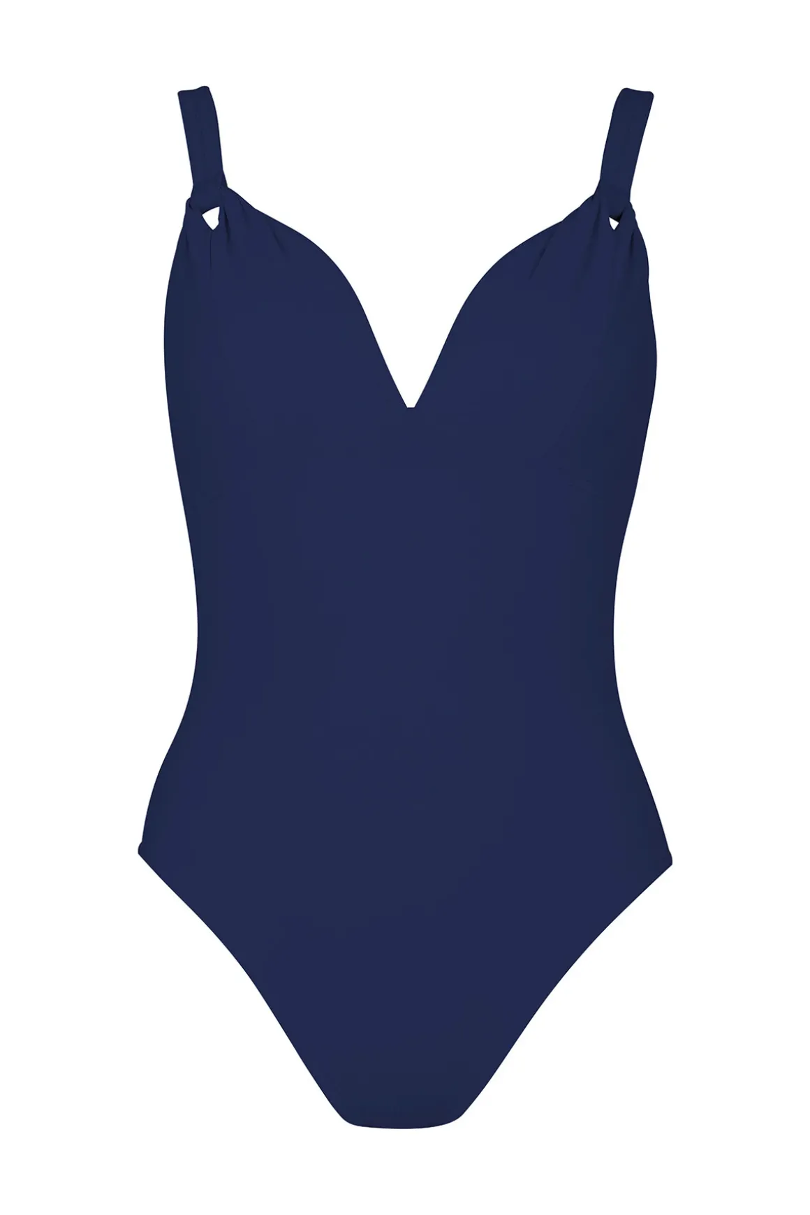 Arlo one piece swimsuit features a deep v-neckline and offers silent underwire with moderate bottom coverage.