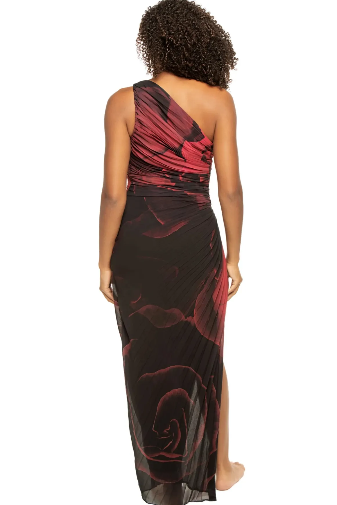 Maxi dress features floral print, asymmetrical neckline, pleating and shirring throughout, and a high side slit.